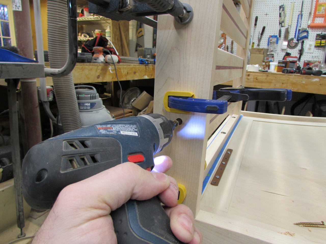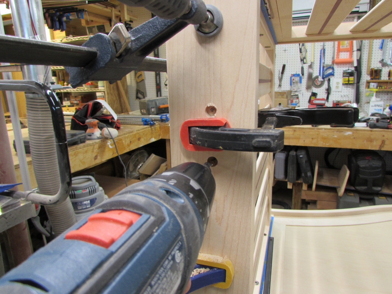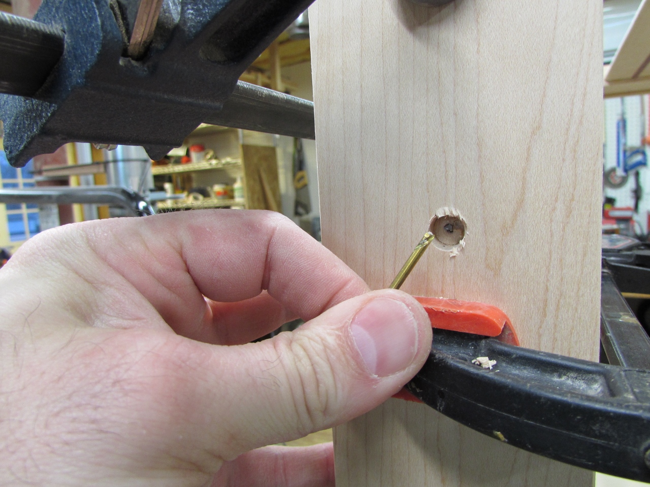 Remember the sides were not glued up yet. That was so I could locate the back piece of the frames, to drill out. I firmly clamped the back piece, from each side, in place, then removed the rest.