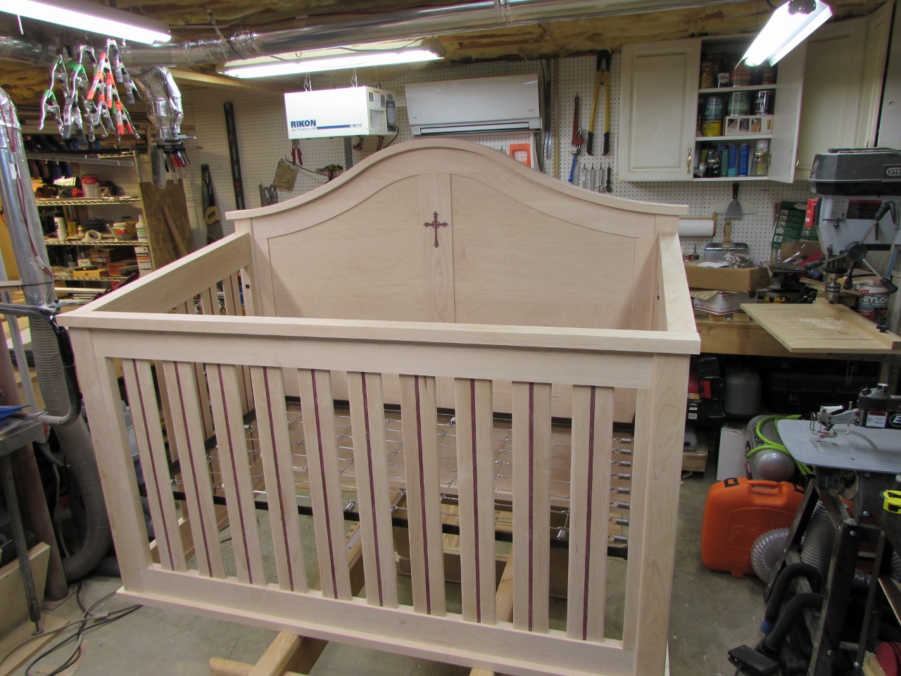 When everything was dry, I pulled the tape and re-assembled the crib. I went ahead and installed the crib frame, to see how it fit. I am pretty sure the frame is installed upside down, in this picture, but that is ok. I have to take the whole thing apart to finish it anyway.