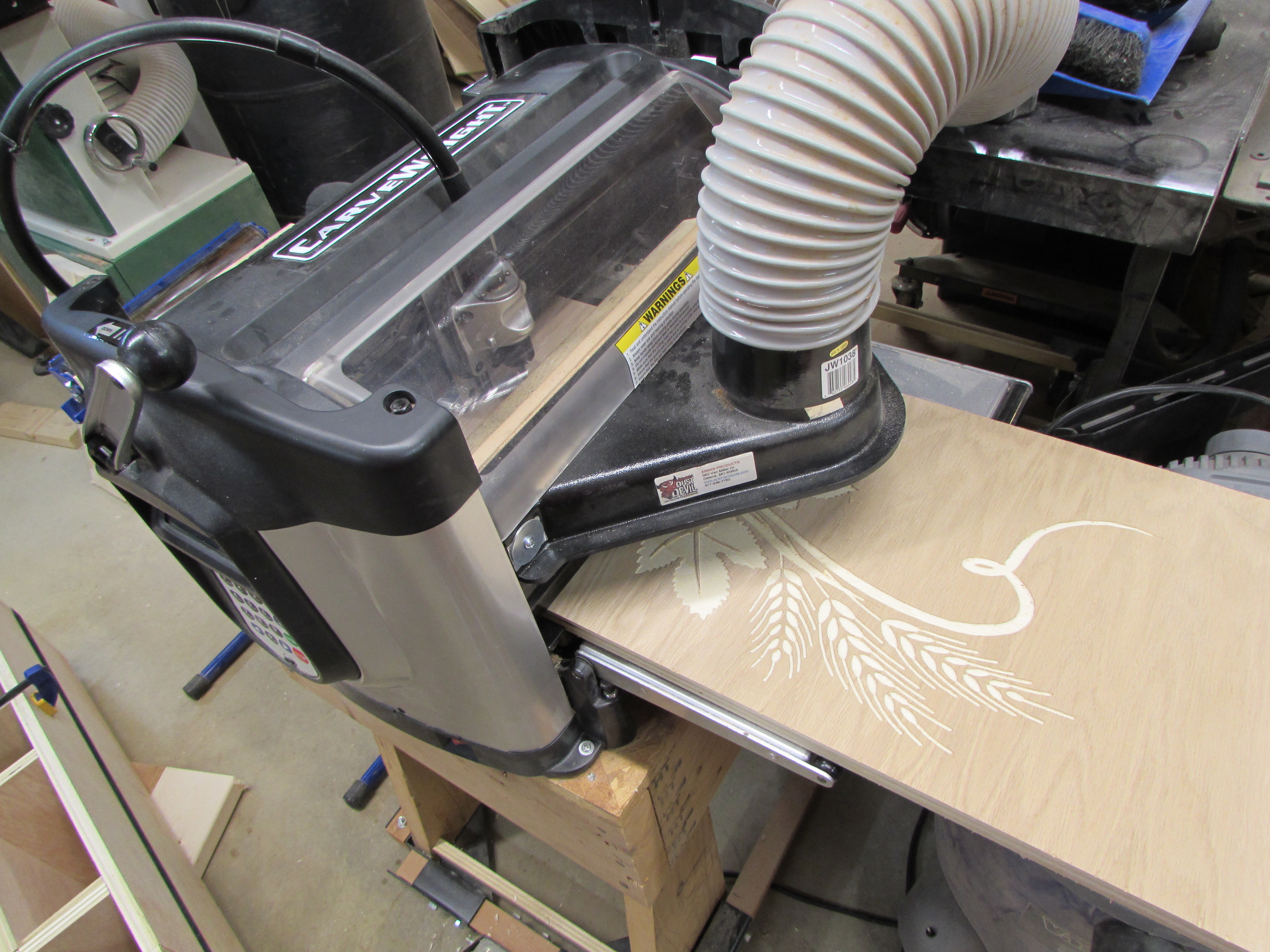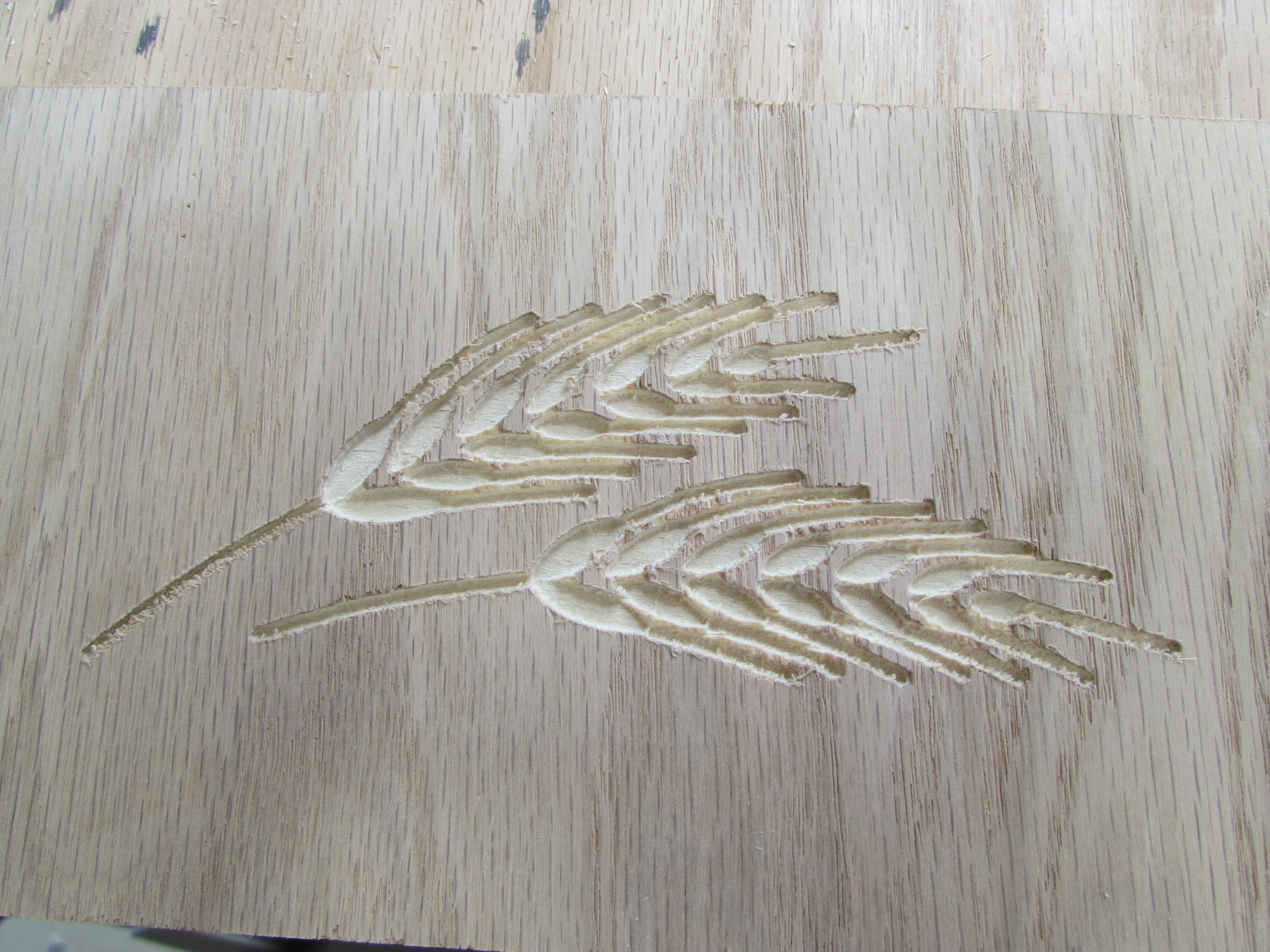 Since I did not feel that the result was acceptable, I sat back down at the computer and increased the size of the image as well as increasing the size of the carving bit to 1/16″. By moving to the larger bit, the software in my carver automatically slowed down. I also decided to decrease the depth to .04″. I used a piece of the wheat and part of the front picture as well, in the new test carve.