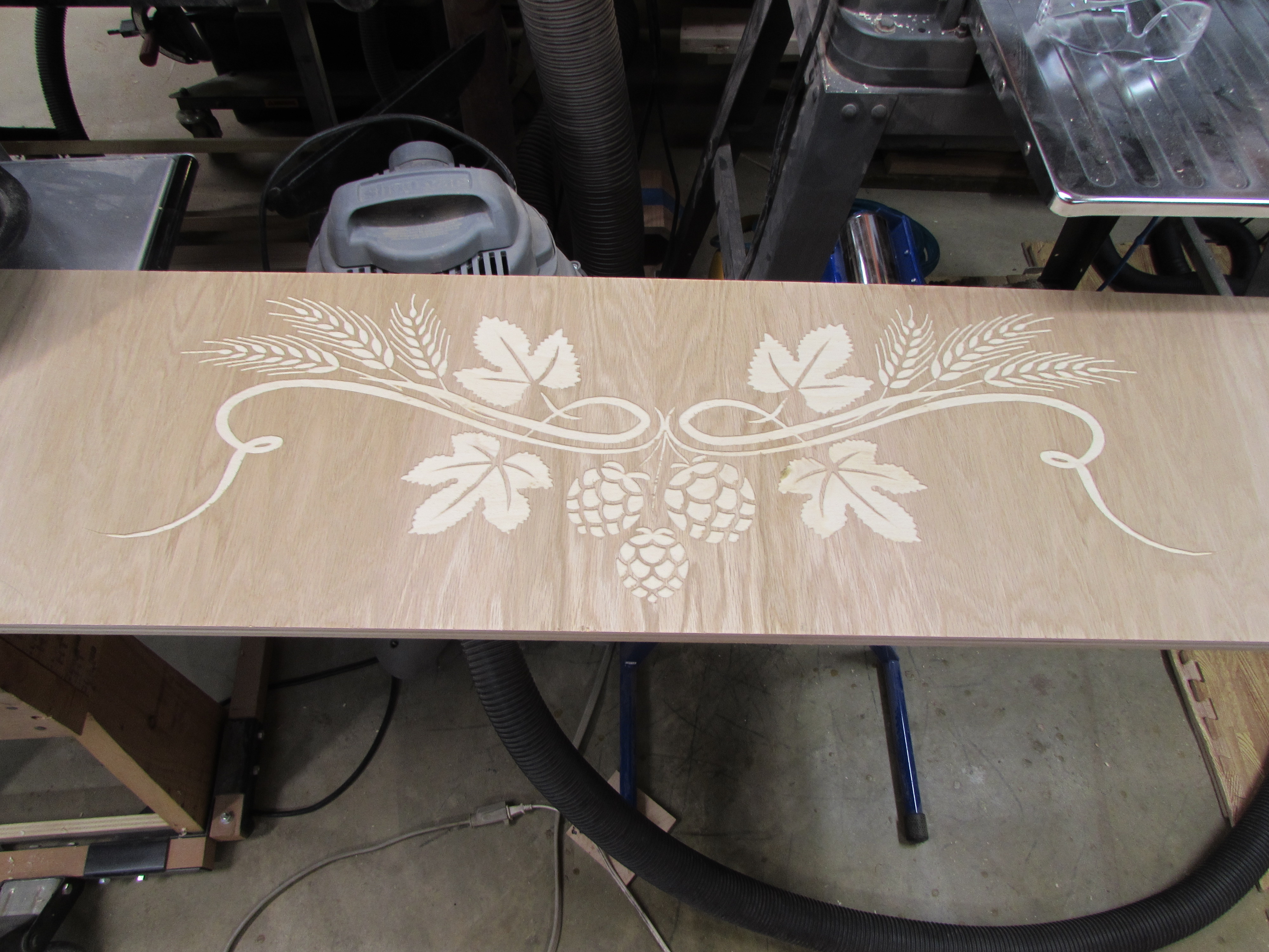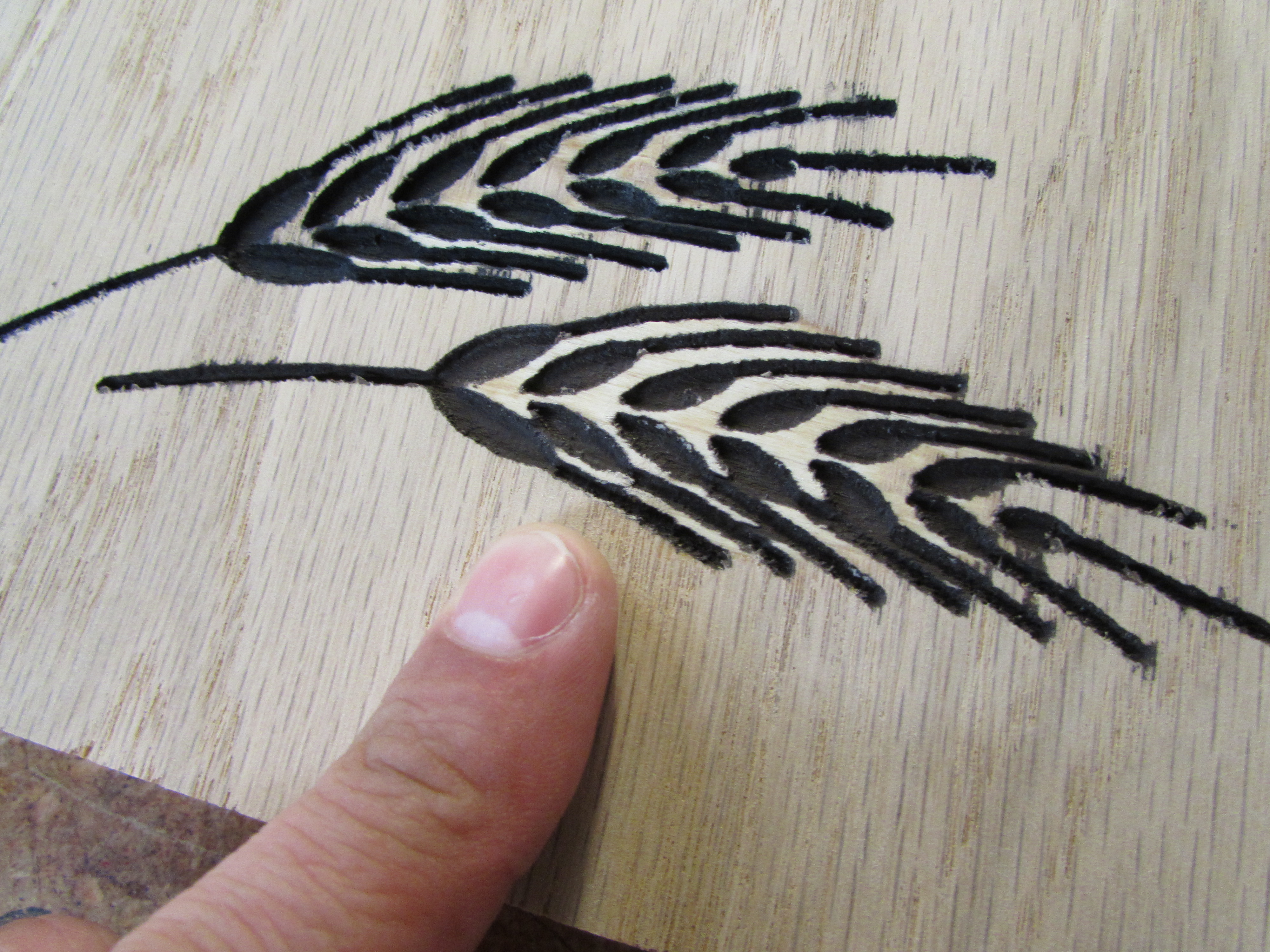 So the plan is to do some carving on the front of the fireplace, just below the mantle, and on the sides of the corbels. I am not so worried about carving the corbels, because they will be made of solid oak, but I am not so sure about the plywood. The veneer that they use today is so thin that you can sand right through it. I don’t know what kind of tear-out I will run into. I decided to do a couple of tests to see what I would run into. I started with the Wheat that I planned to carve into the corbels, because it had more detailed areas than the larger carving, that will go in the front. I used my 1/32″ carving bit, and ran it 1/16″ deep.