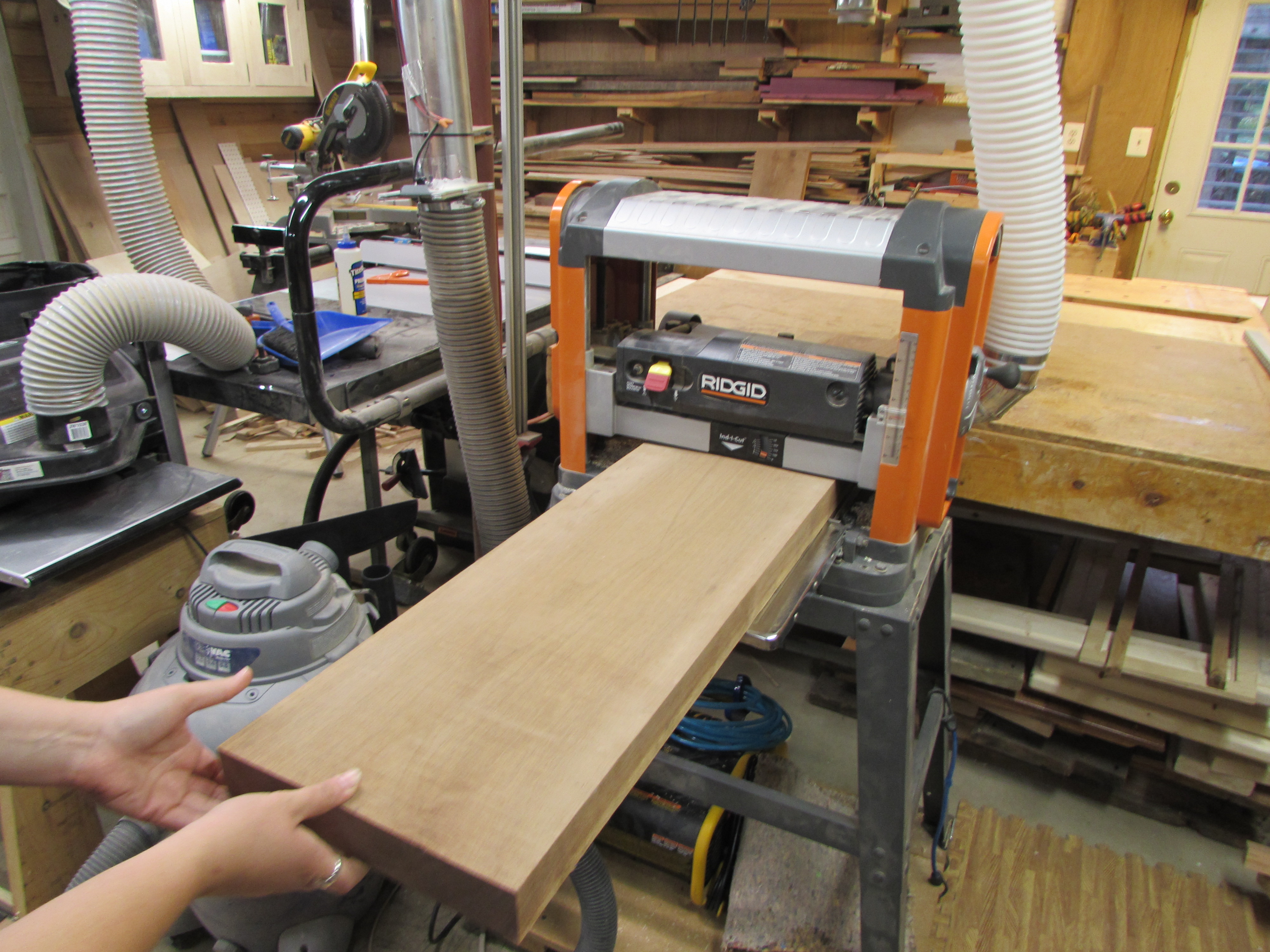After I finished with the carving, I handed it off to Erin to take home and paint. She will bring it back later this week and we can sand it down to see the final product. Erin had a few hours to play last night, so I showed her how to use the planer. She pulled the clamps on the panel that she glued up a couple of days ago and planed it down to 3/4″ thick.