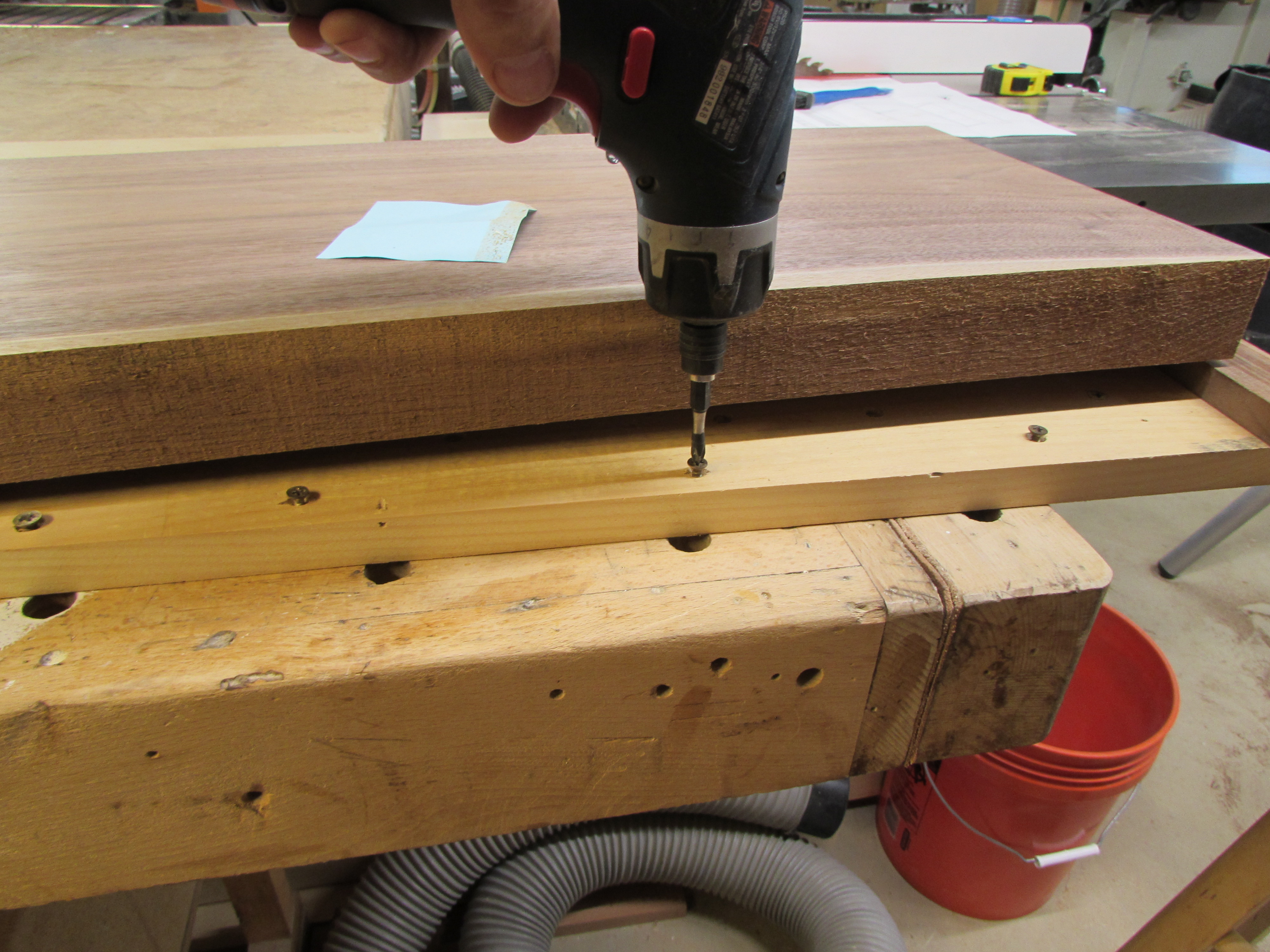 Since this board was air-dried, without anything forcing it to remain dead straight, the board had developed a twist. If you held down one corner, the opposite corner went up nearly 1/2″ in the air. We really need the board to be flat, so I pulled out my homemade planing sled. The planer puts a lot of force down on the board when it is cutting and tends to just roll the board as it cuts. To fix this, I have screws all over my sled that can be raised up to support the high spots on the board and prevent the planer from pushing those areas down. It basically forces the planer to cut off the high points on the top, creating one truly flat side.