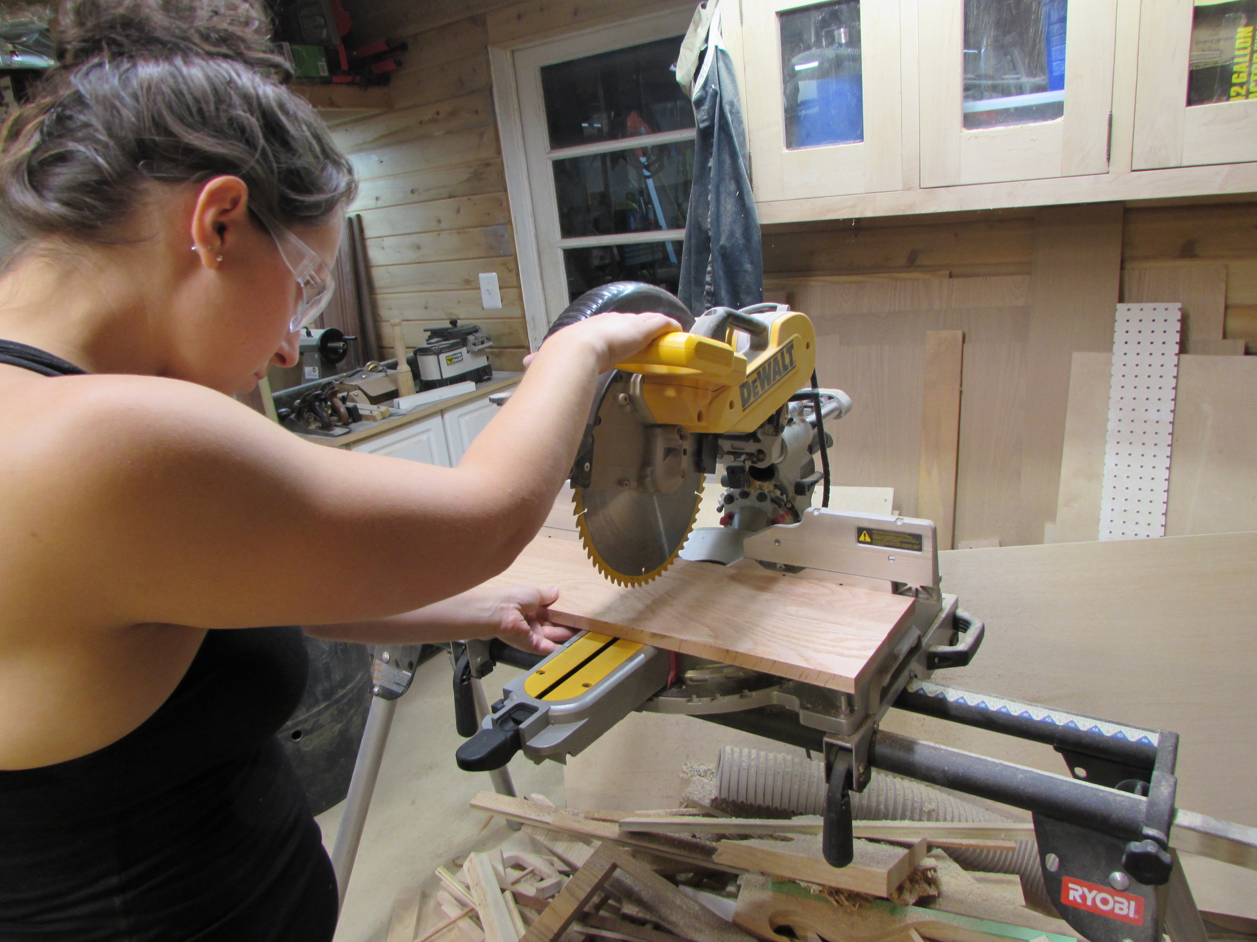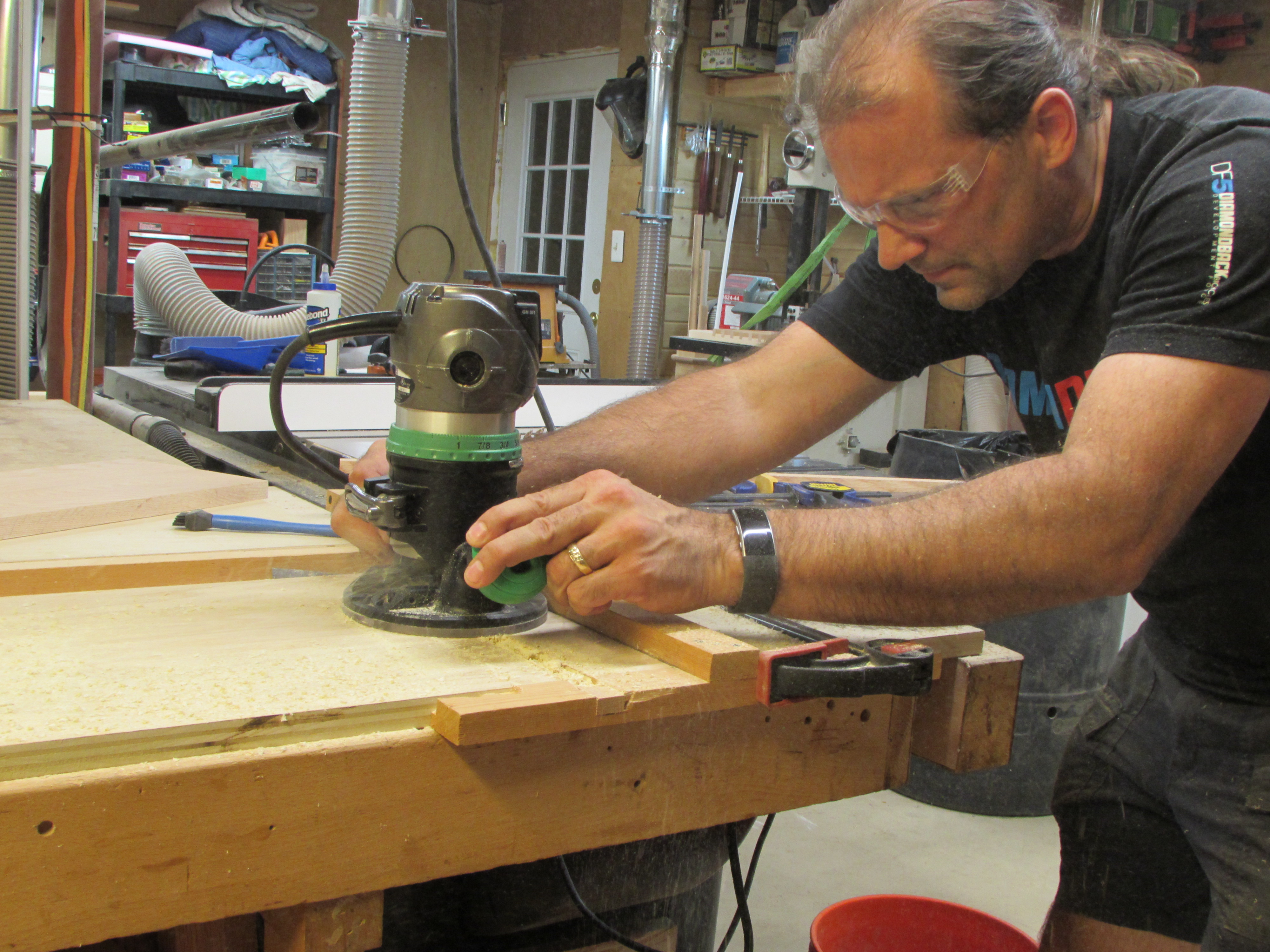 Since the router bit is round and the shelf is square, I handed Erin the chisel to clean out the ends and square them up.