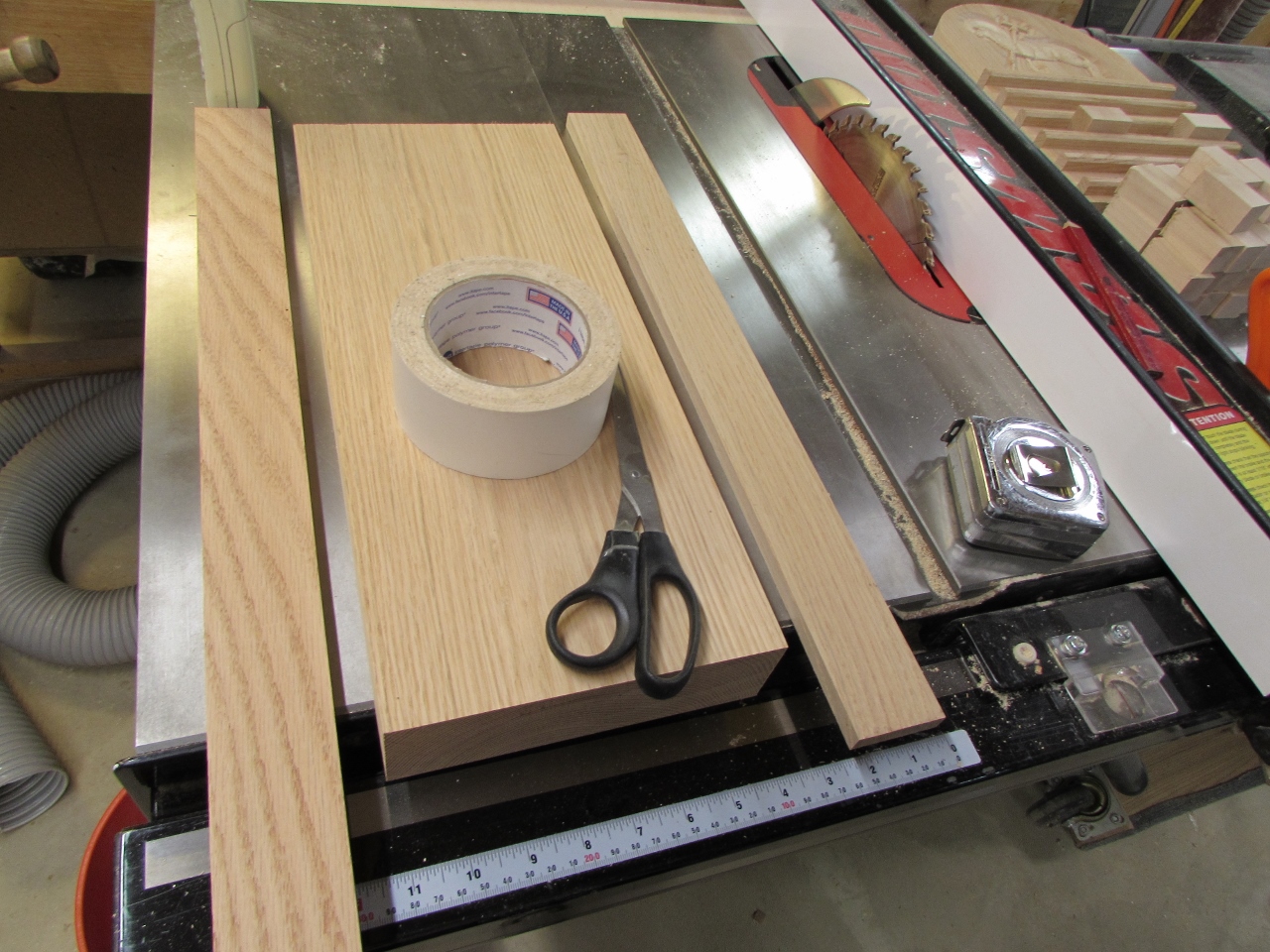Once I cut the big board into two 15″ long pieces, I then needed to make it a bit wider for the CNC. The corbels are 7″ wide, but to carve them, the CNC requires 1/2″ of wood, additionally around each side of the carve. Since it is going to be cut away, I just added a 1/2″ strip to each side with some double-sided tape.