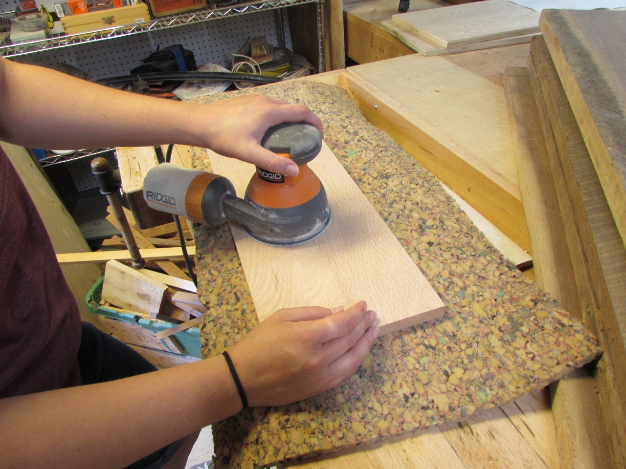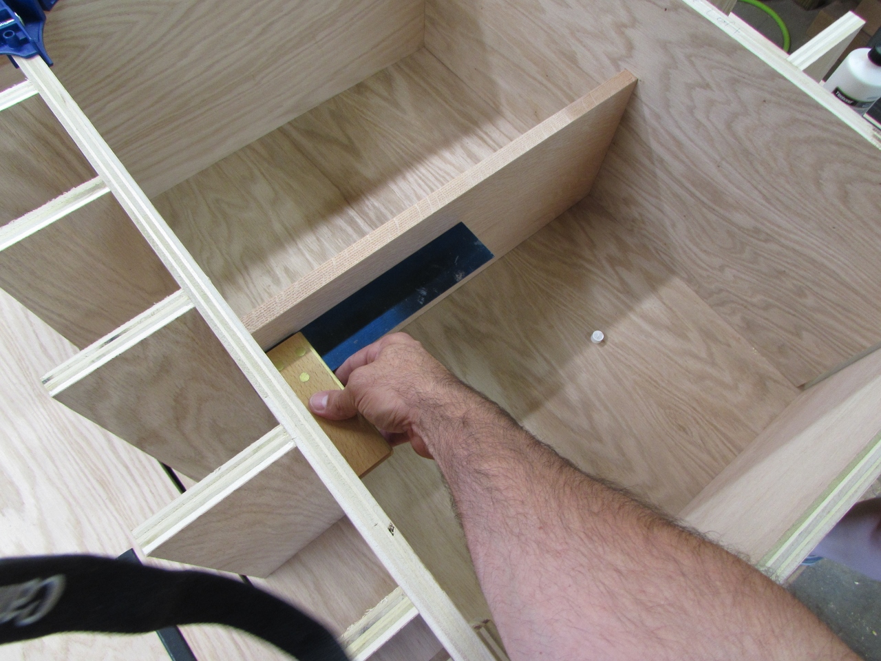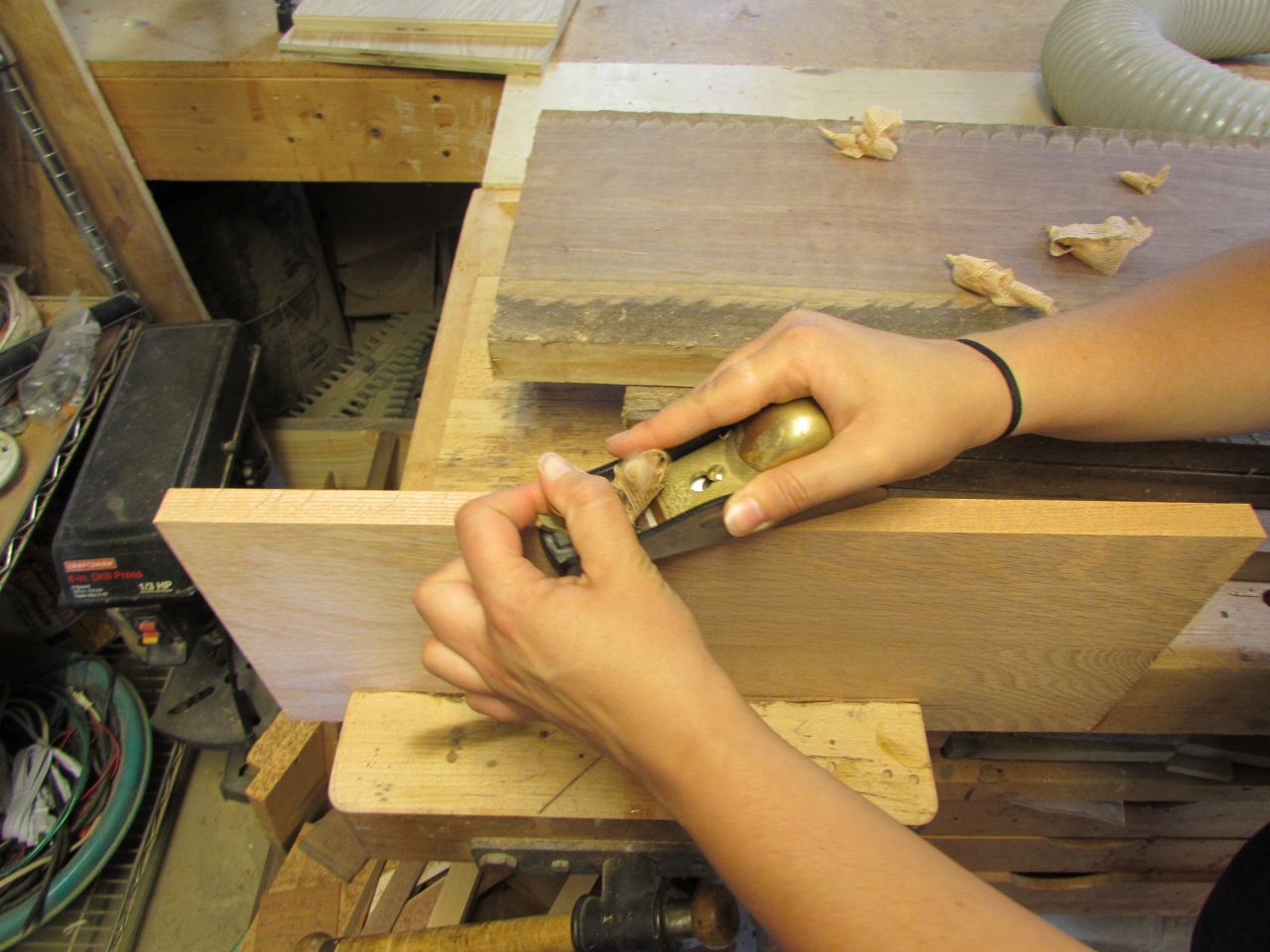 Before inserting the center shelf, Erin cleaned up the edge with a block plane, then sanded the top and bottom of the shelf.