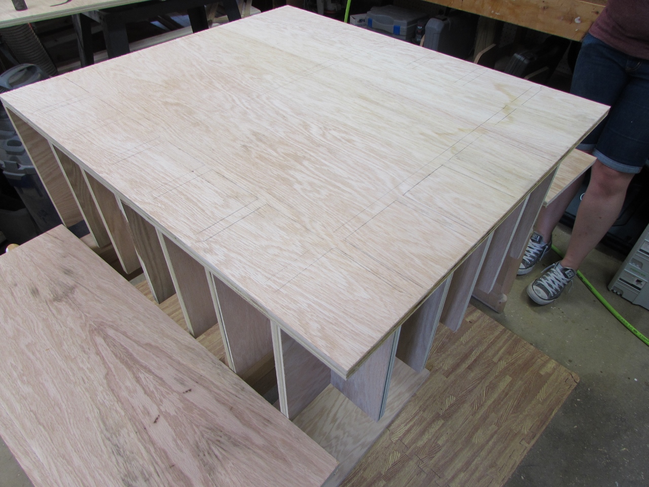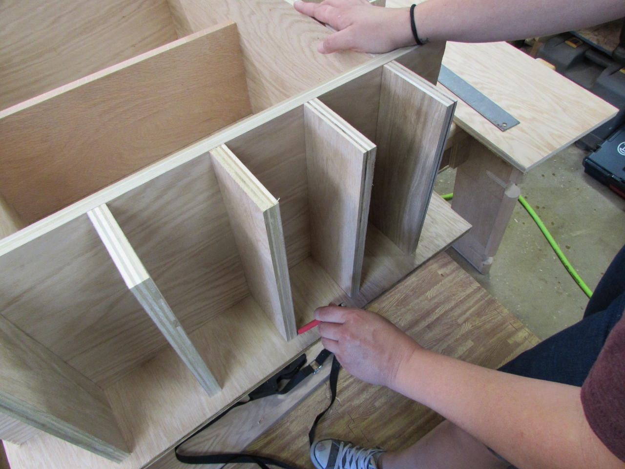 Once the main body was assembled, we flipped over the back panel over, and traced the outline of each board on it. This will tell us where we can nail when we attach it.
