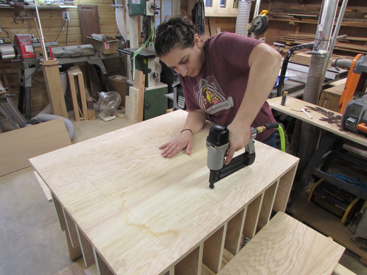 Erin applied glue to the back side of the shelves, then we carefully lined up the back panel and laid it in place. Next, she nailed the panel on, staying in between the lines that we just traced on the back of the panel.