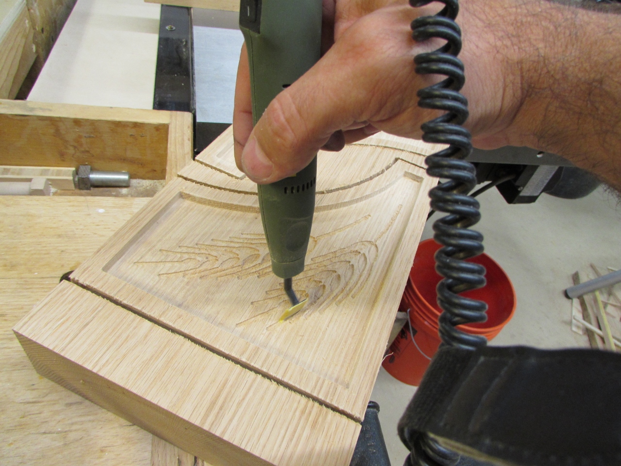 Erin did do her homework and finished painting the carved face board, so I had her work on carefully sanding away the excess paint while I worked on sanding the carved corbels, with my Proxxon pen sander. It is a little small, but good for sanding the details.
