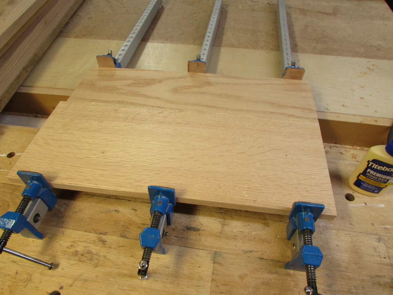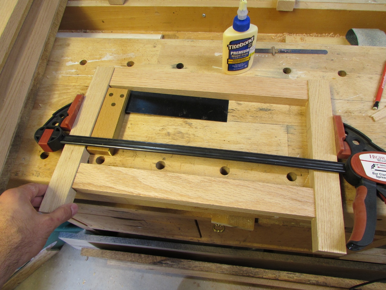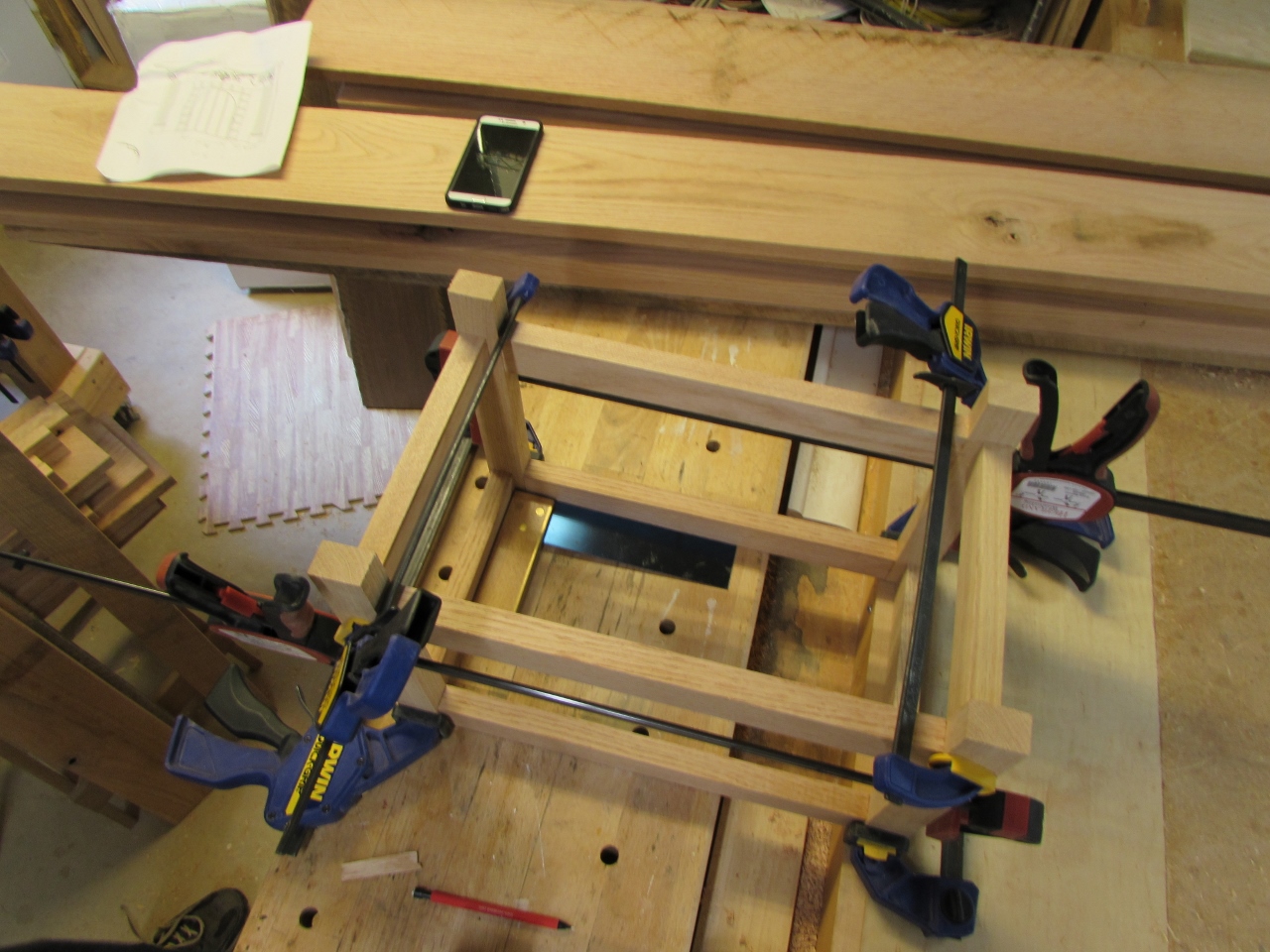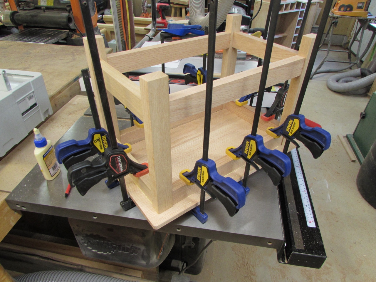 I clamped up the sides first, making sure everything was straight and square, then installed the short cross bars, and clamped the front to the back.
