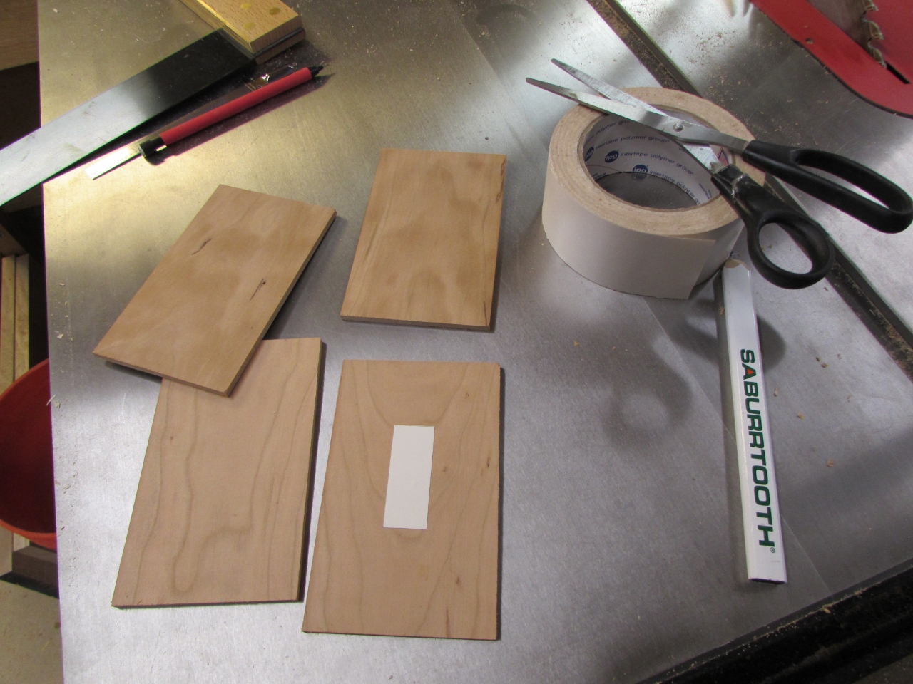 I want to tie all of the pieces together with a small cross, so I dug into my scrap pile for some scraps of cherry, that were left over from the Papal Chair build. I had an 1/8″ thick piece that would work perfectly. I cut it into four parts and used pieces of double-sided tape to hold them lined up together, then I laid out the cross on the top one.