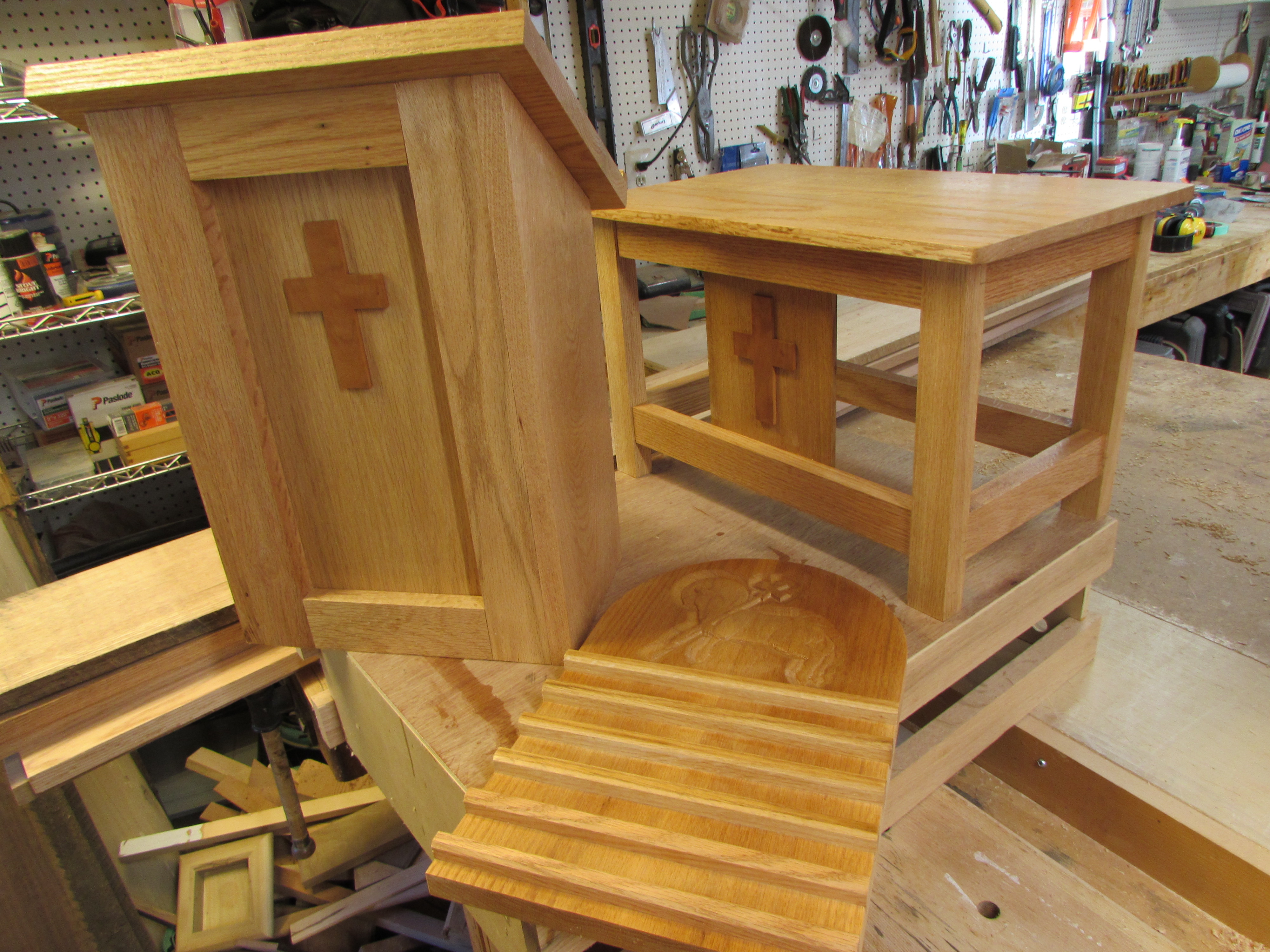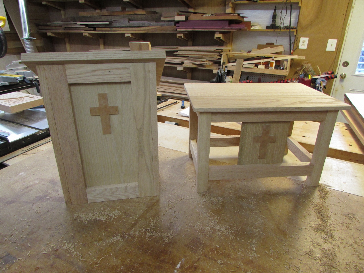 The second big piece in this set is the altar. I started by planing down a couple of boards to 3/8″ thick, then glued them up to be the top panel.