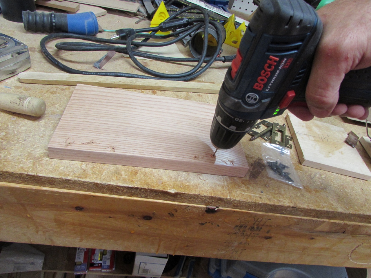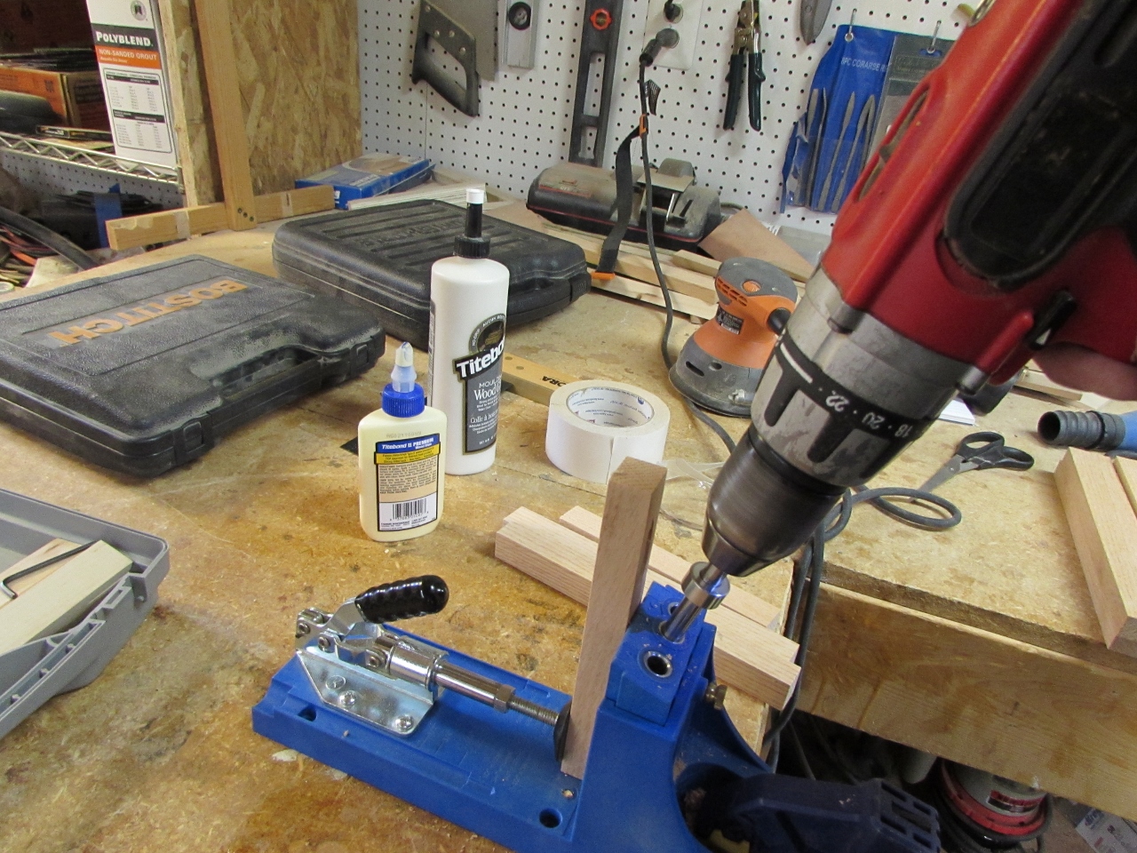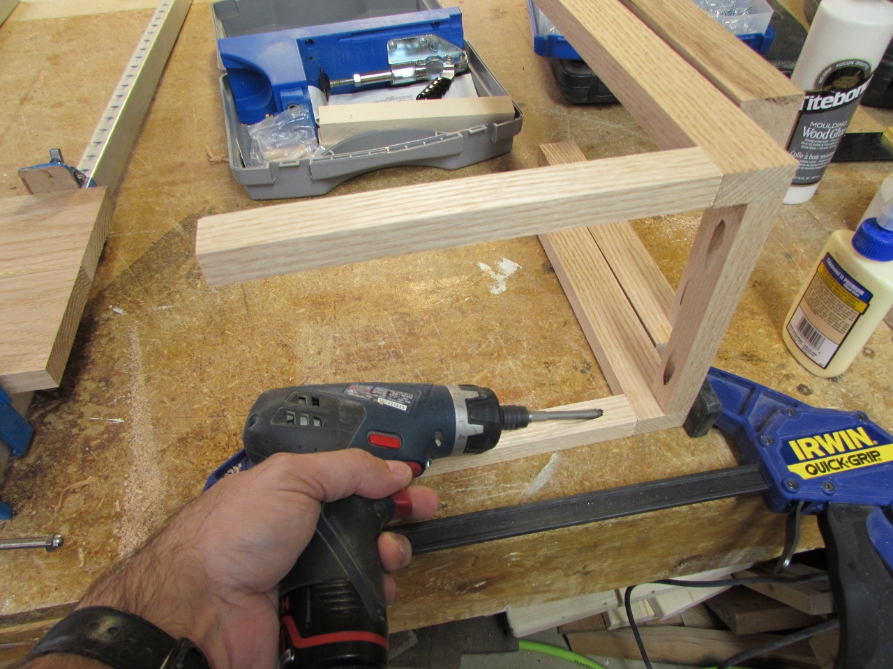 I decided to assemble the apron with pocket holes, so I got out my Kreg jig and carefully drilled a hole at each end.