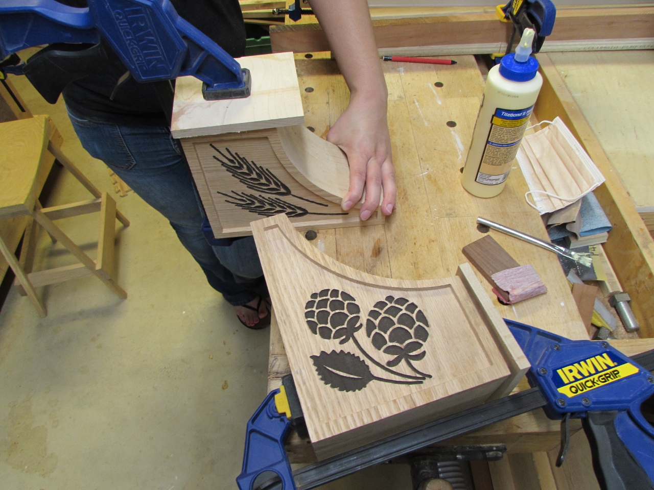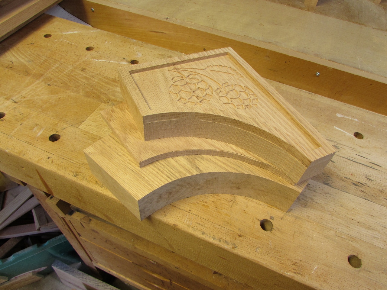 If you recall, I accidentally carved two left-side corbels, so I scavenged around to find some thicker wood to create another. I ran out of 8/4, so I used a piece of 6/4 and a thinner piece to make up the difference. I also drew up a pair of hops instead of another wheat stalk, to carve. It turned out better than the wheat, less tear-out.