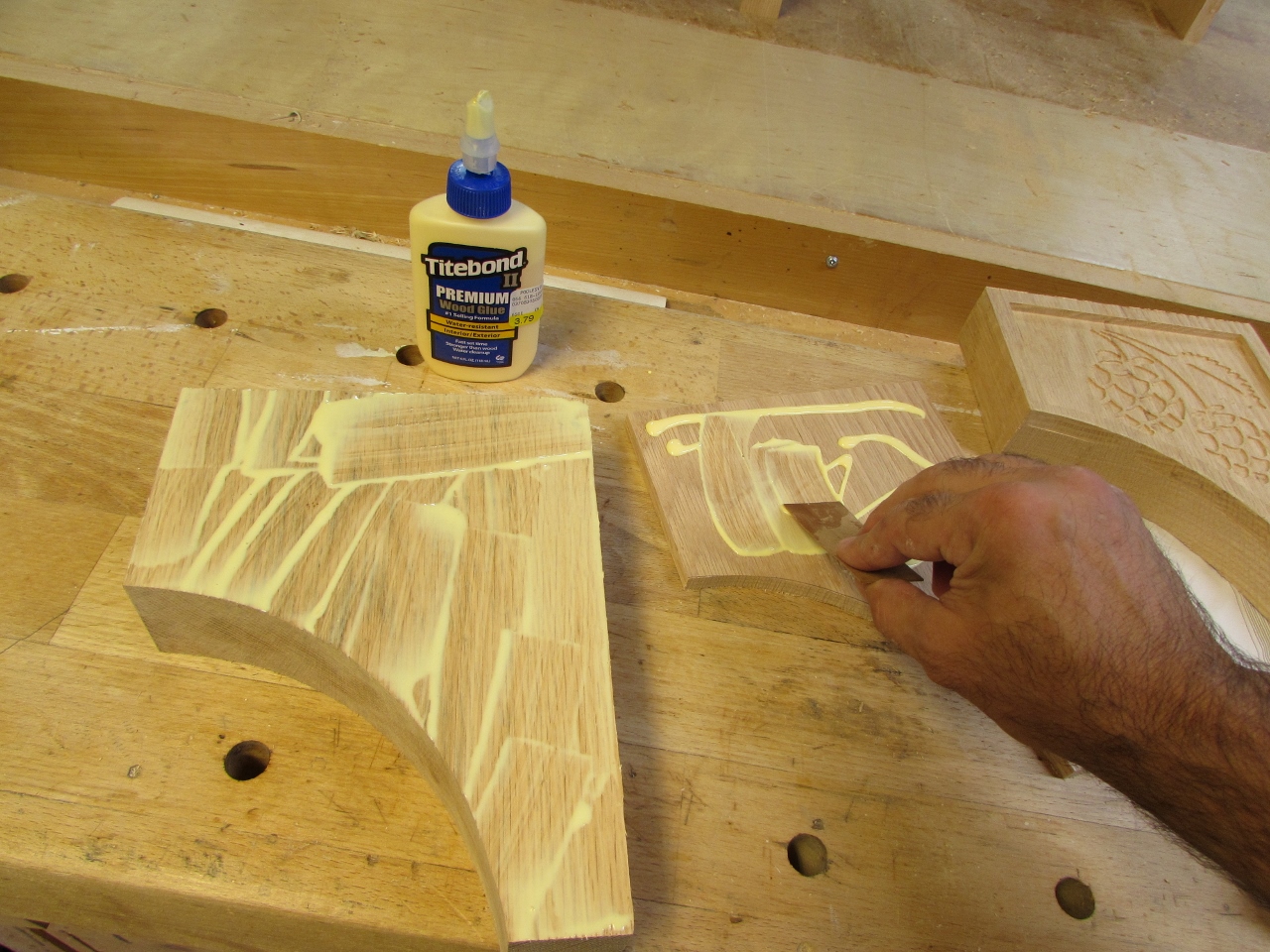 I used a couple of square maple plates to evenly spread the clamping pressure along the face of the rosettes, when clamped.