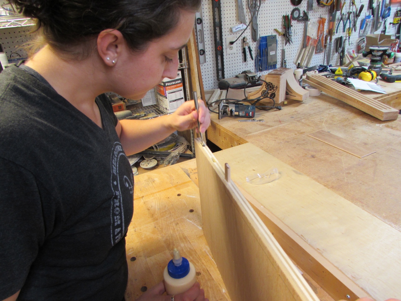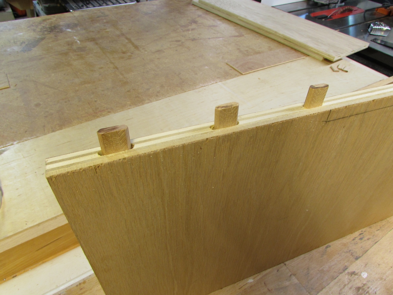 Erin applied some wood glue to each mortise, then I tapped a floating tenon into each hole.