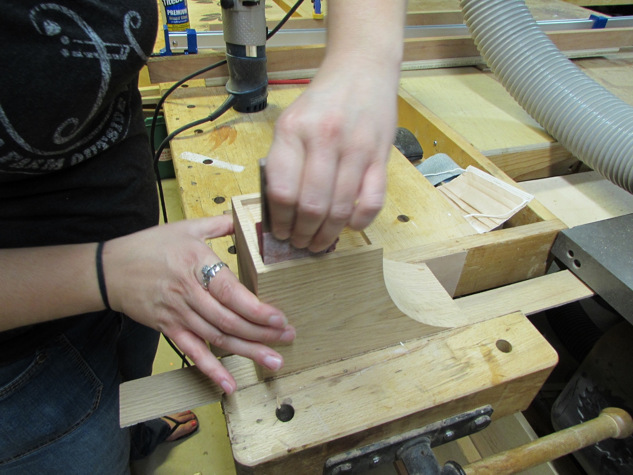 While that was drying, we moved over to work on the last corbel. Erin cut the 1/4″ deep recess with the router and I cleaned up the edges with a sharp chisel.