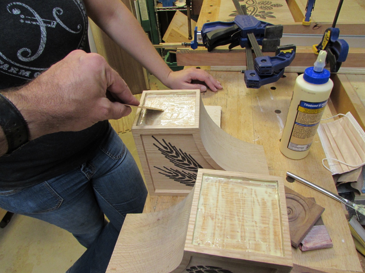 Erin then proceeded to apply glue to the other side, and we clamped them up to dry. I used some straight, rigid cherry boards to hold the entire assembly flat at each joint.