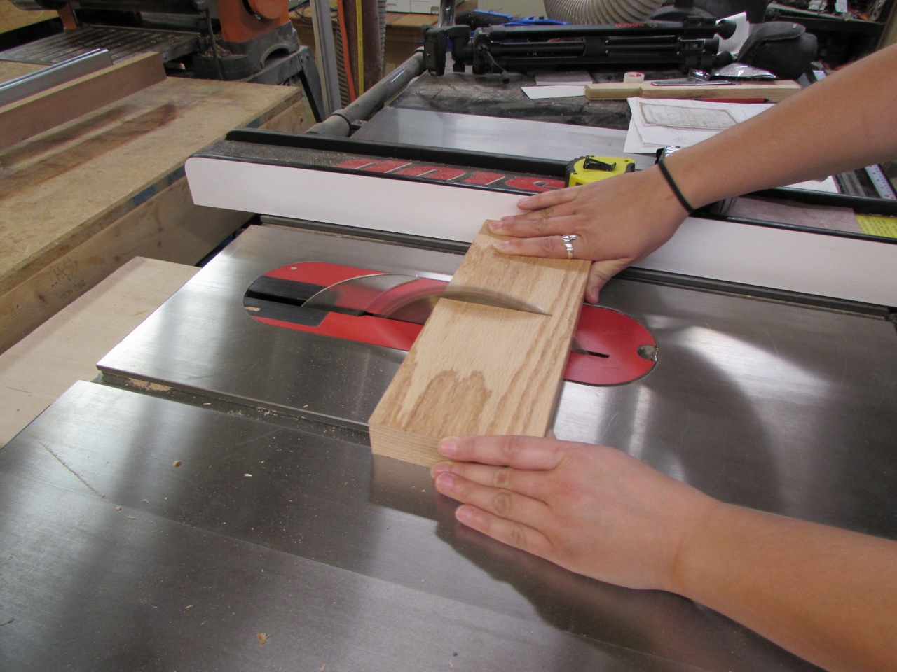 In order to attach the two sides to the top, we are using my new Domino jointer. We wanted the grain to match all the way around the face, but we had to cut the top off to fit into my carver. We lined the side pieces back in place, and marked the location of the Dominos.