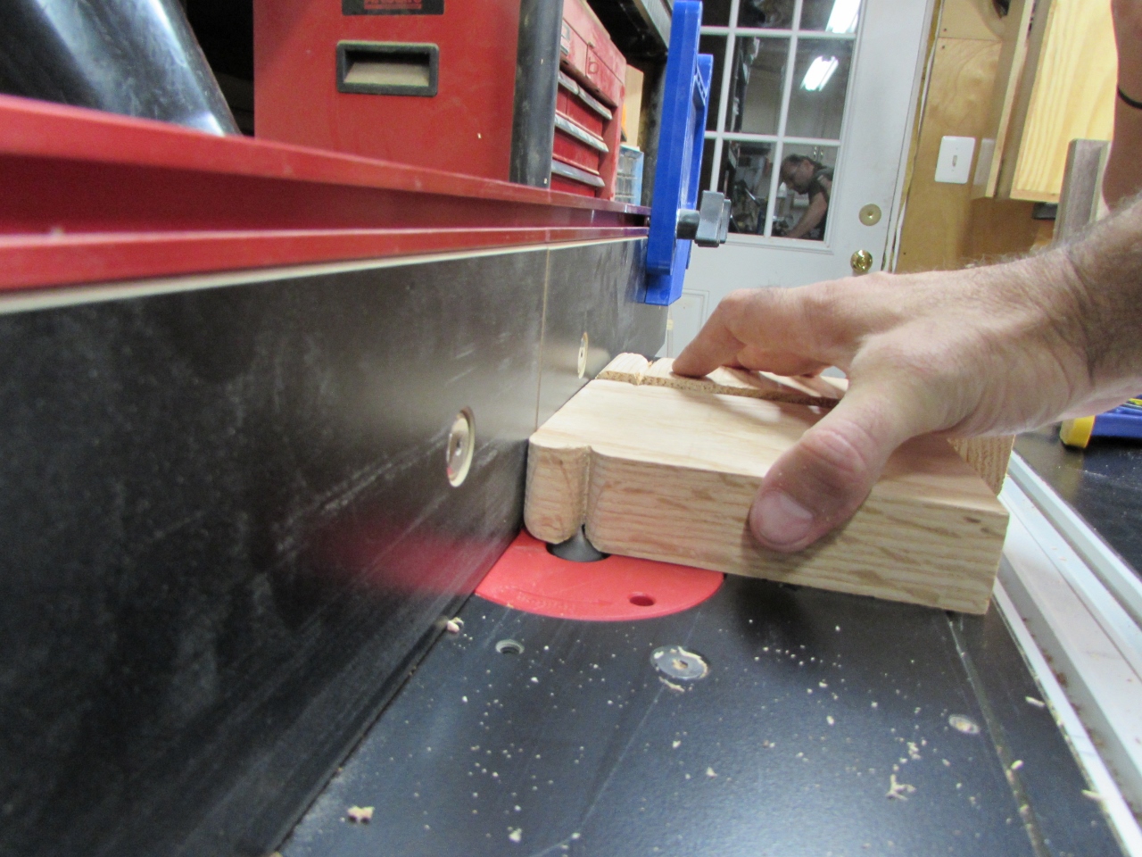 To create the bead at the top of the plinth, we used a 3/8″ round-over bit for the top three sides, on the router table. For the inner bead, I bought a 3/8″ point cutting round-over bit. We set the fence back 3/4″ and cut the bead in over several passes, raising the bit with each pass until we got the depth we wanted.