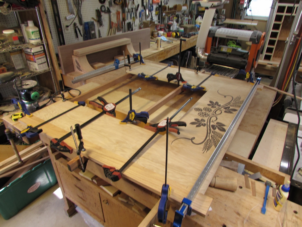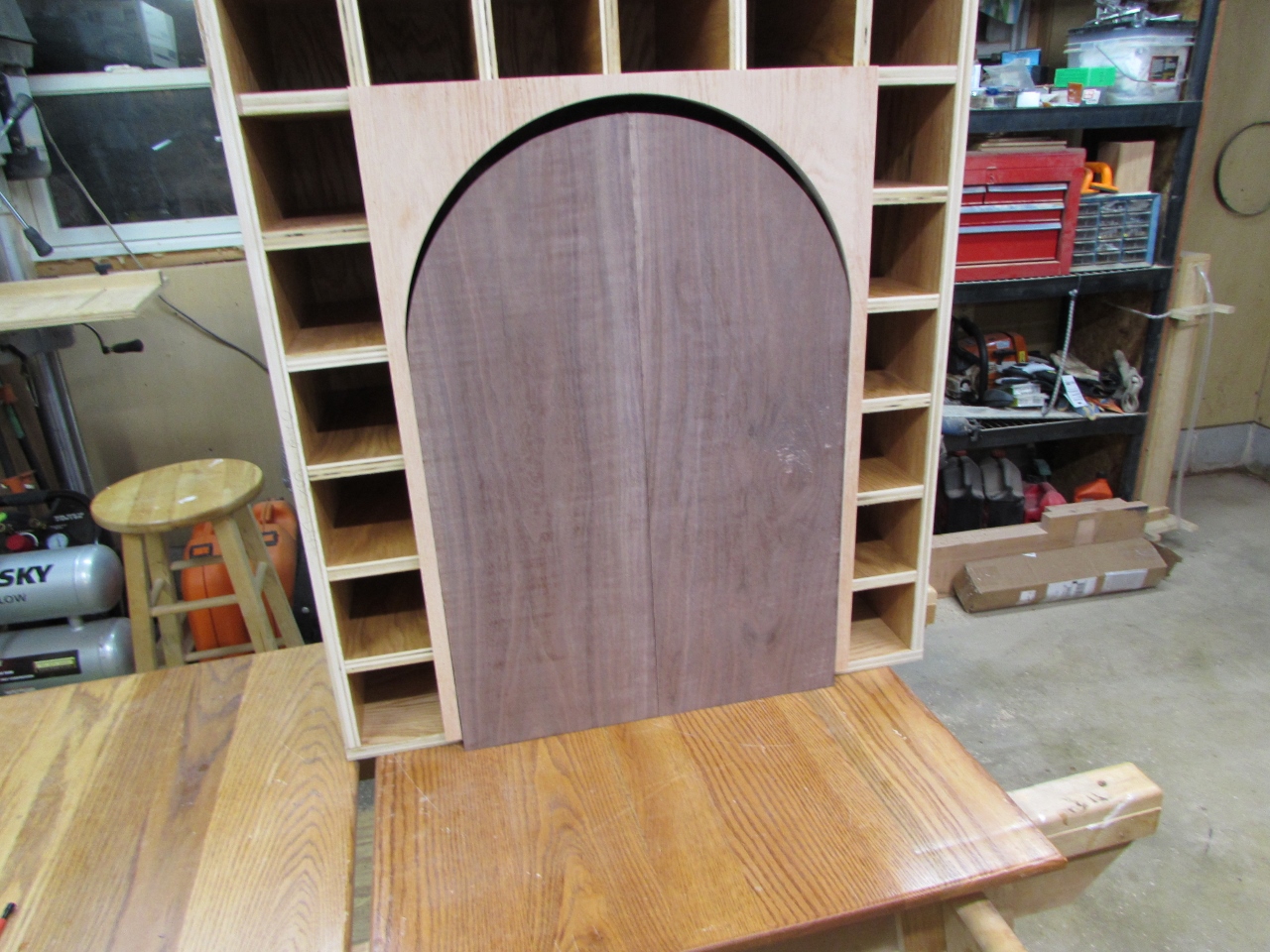 I need an arched opening for the door so I glued up a large panel and tried to match the grain and color as closely as possible. To achieve that, It all came from the same board. Before joining the two halves, I cut away a strip to use as the sides of the door opening, then, when the panel was dry, I loaded it into the CNC and started the arches carving.