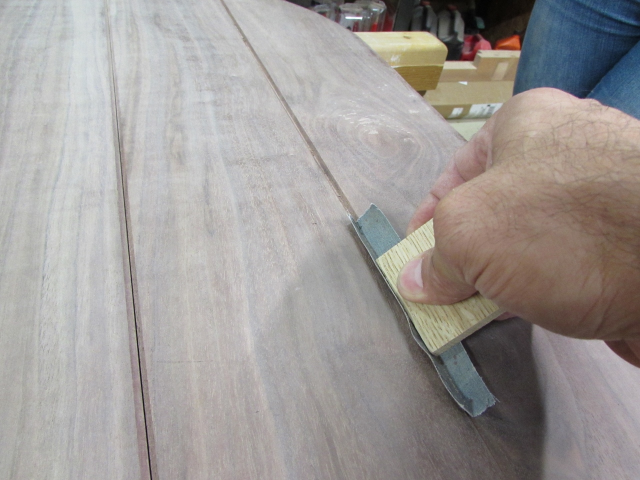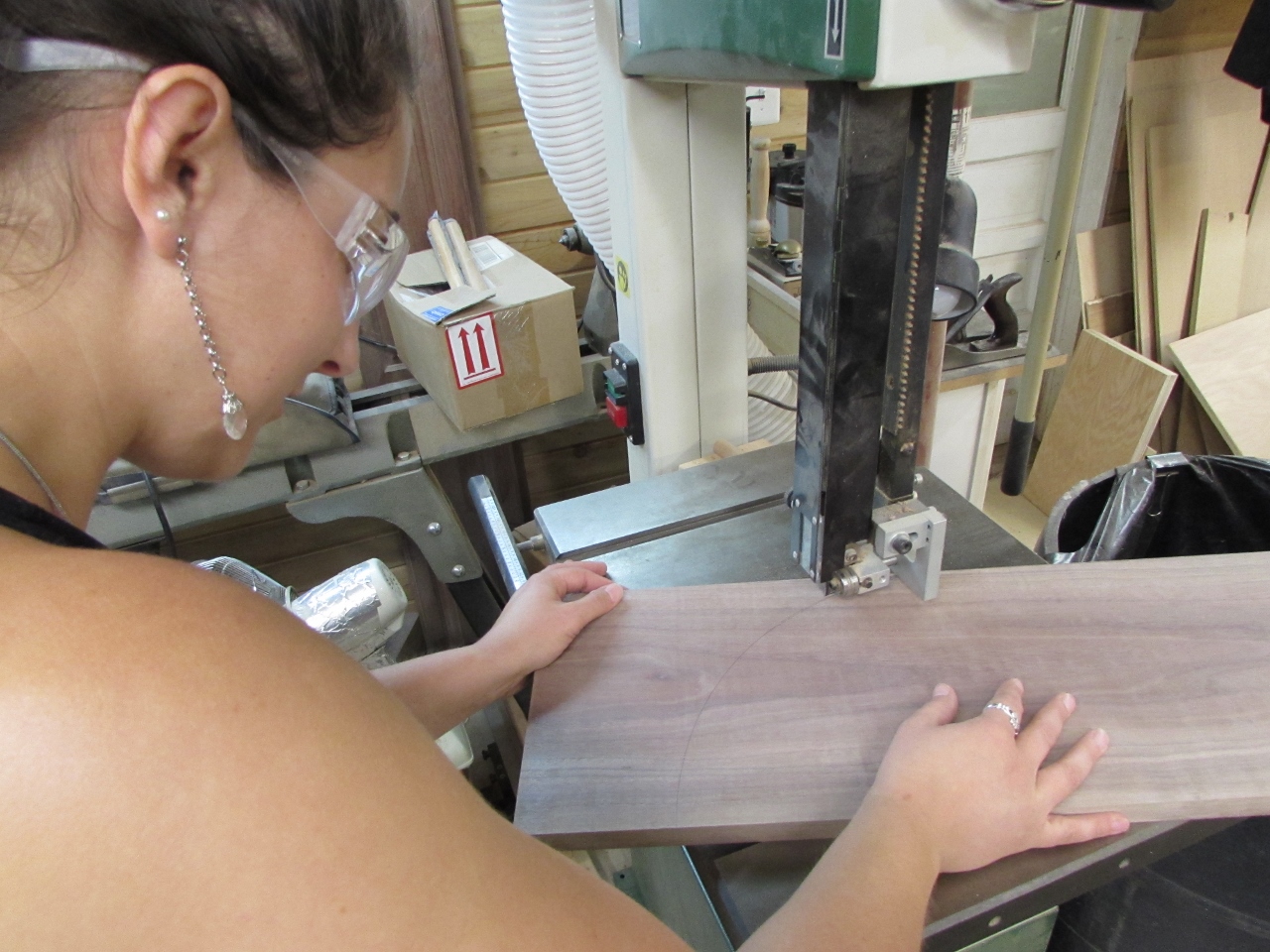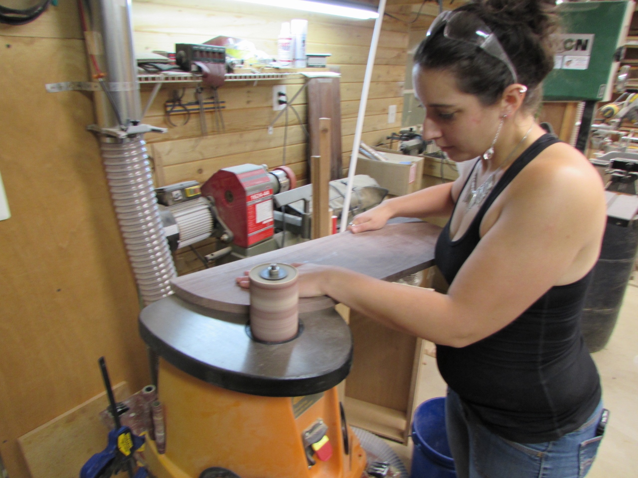 She cut just outside the line, then sanded the panel down the rest of the way on the spindle sander.