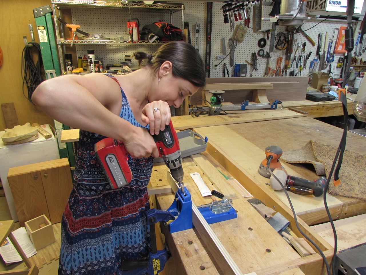 Diana was looking a little bored, so I handed her a drill and set up my Kreg jig so she could drill a bunch of pocket holes into a couple of pieces of 3/4″ plywood. These will be used for temporary flanges for mounting the face to the cabinet.