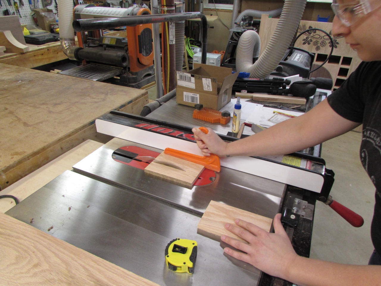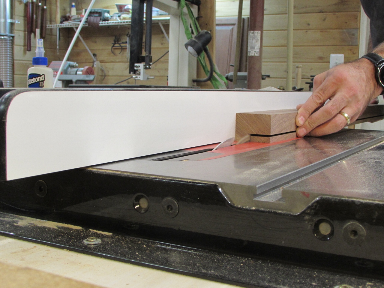 After cutting the 1/2″ pieces to size, she cut down 7/8″ thick blanks for the top two pieces.