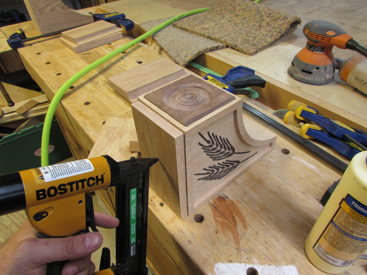 After screwing the corbels into place, I fooled around with a test block, trying to come up with a shape for a piece of walnut, on the top of the plywood. This piece needs to have a mounting flange for screws to be driven, up from the bottom, into the mantle.