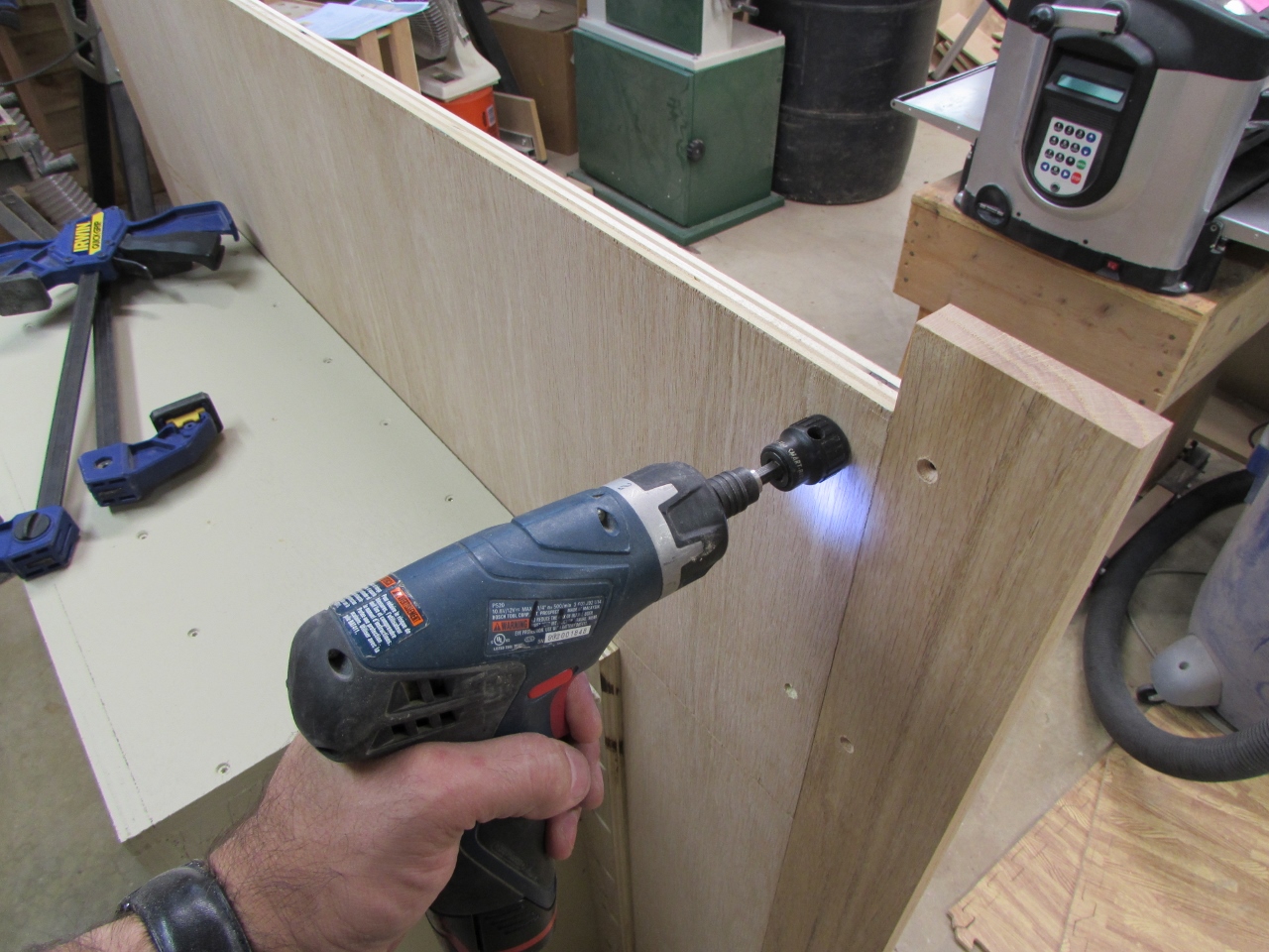 We pre-drilled and counter-sunk where the flange will be screwed into the plywood, as well as through the flange, where the mounting screws will attach to the mantle.