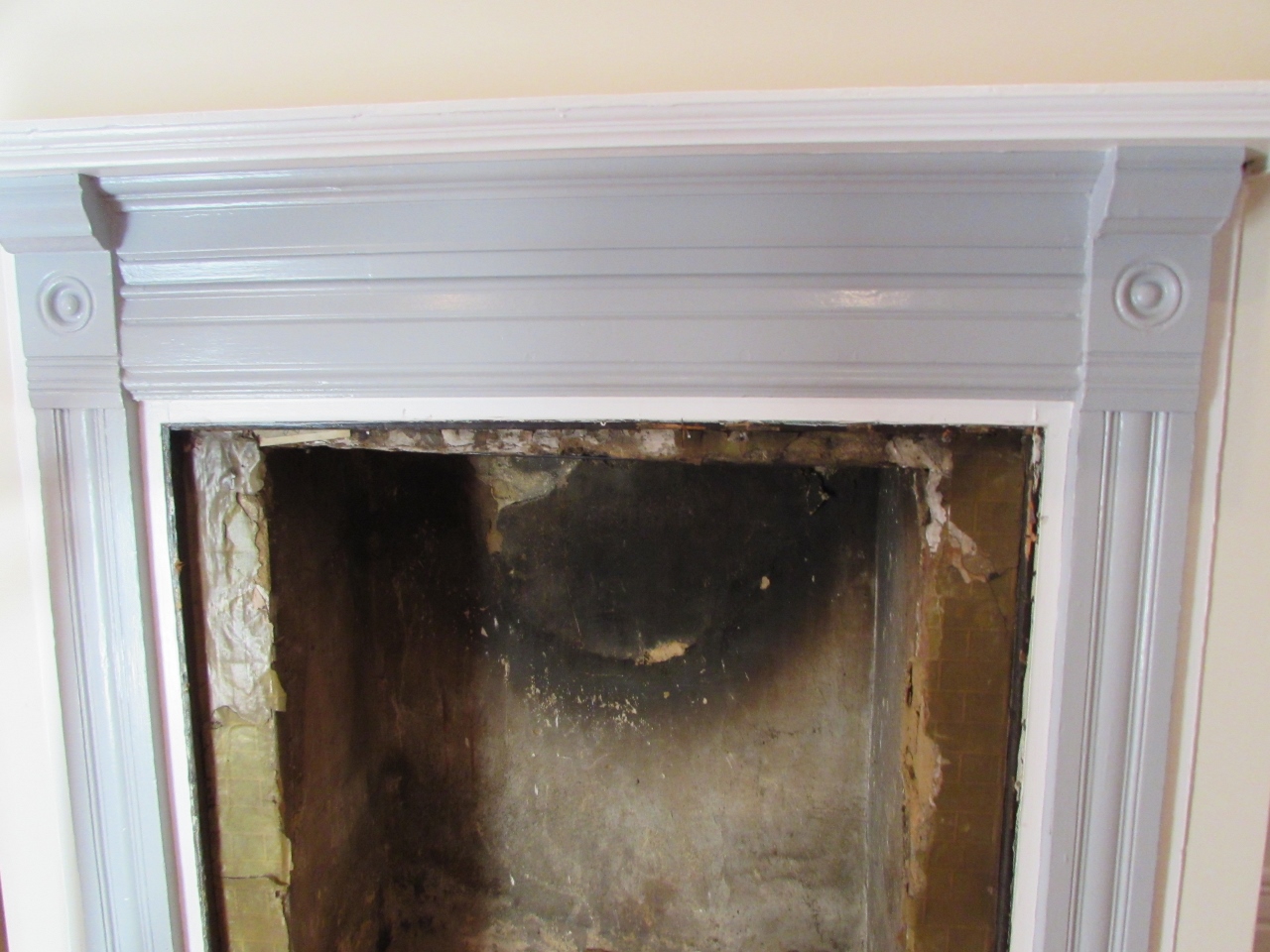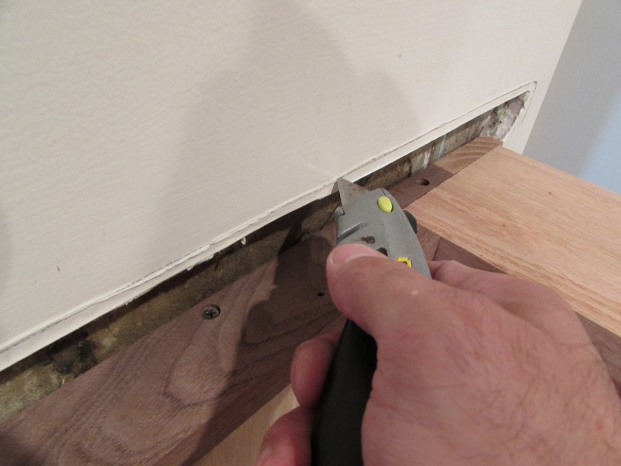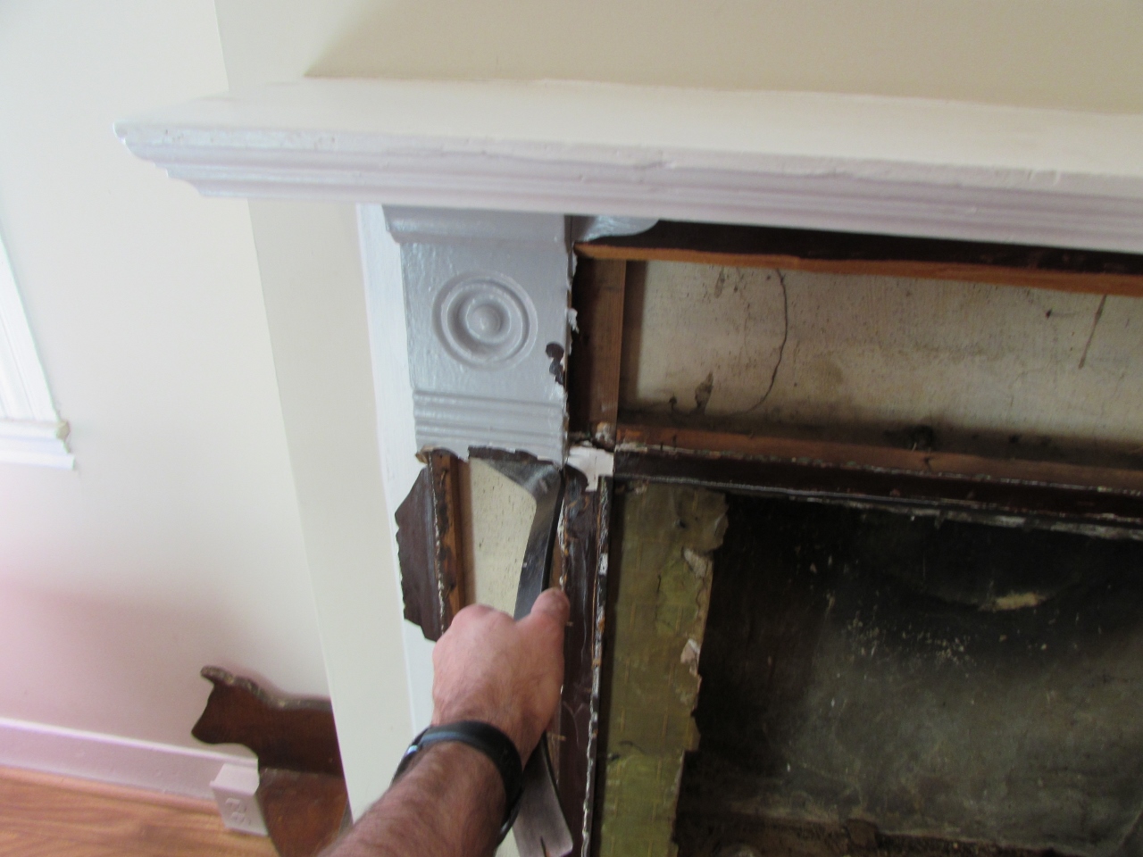 After removing the mantle, I used a utility knife to remove about 1/4″ of the drywall, and I squared off the ends as well.