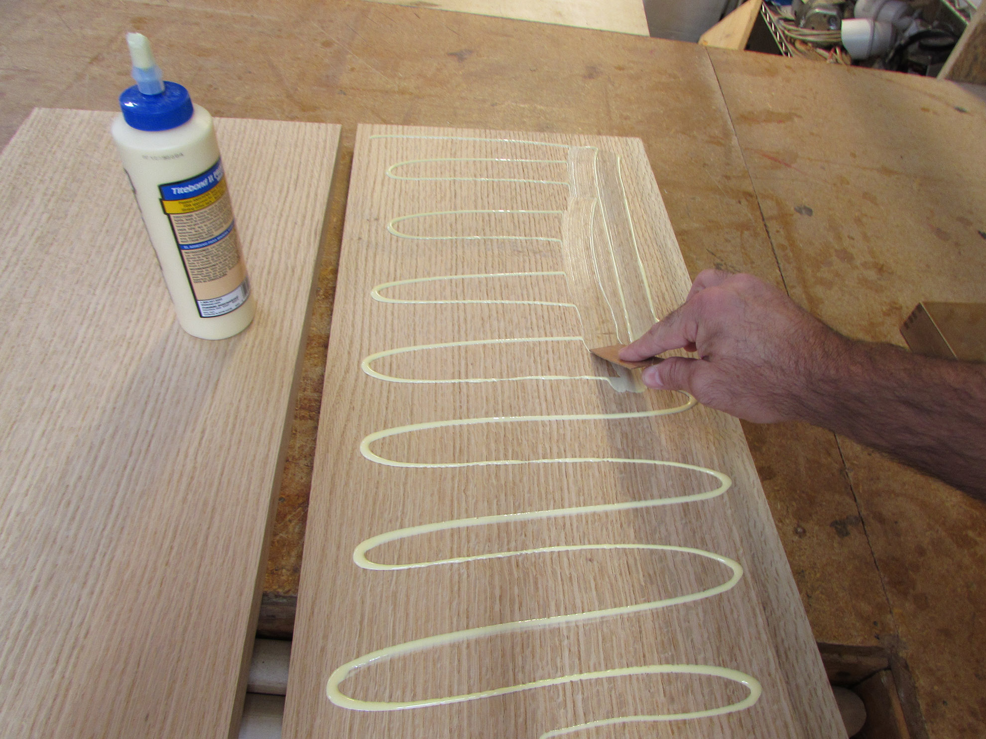 I spread a thin layer of wood glue and clamped the two boards together. I placed a caul across the top and bottom with a piece of leather, in the center, then clamped them tight. I am hoping that the leather, in the center will apply most of the pressure there, where my clamps cannot reach.