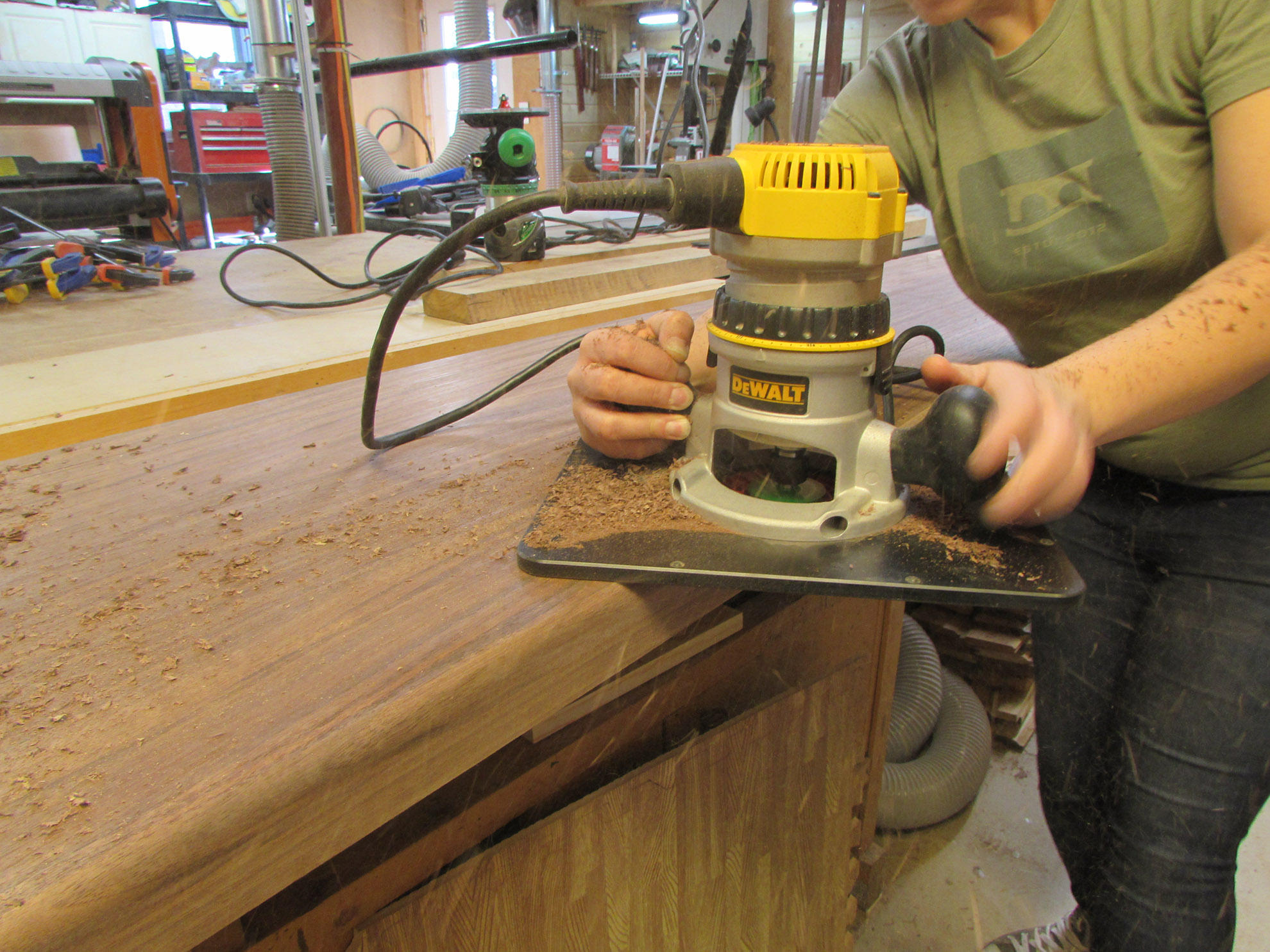 When Erin arrived, I handed her the router, still loaded with the flush-trim bit, and she trimmed up the edges, all the way around.