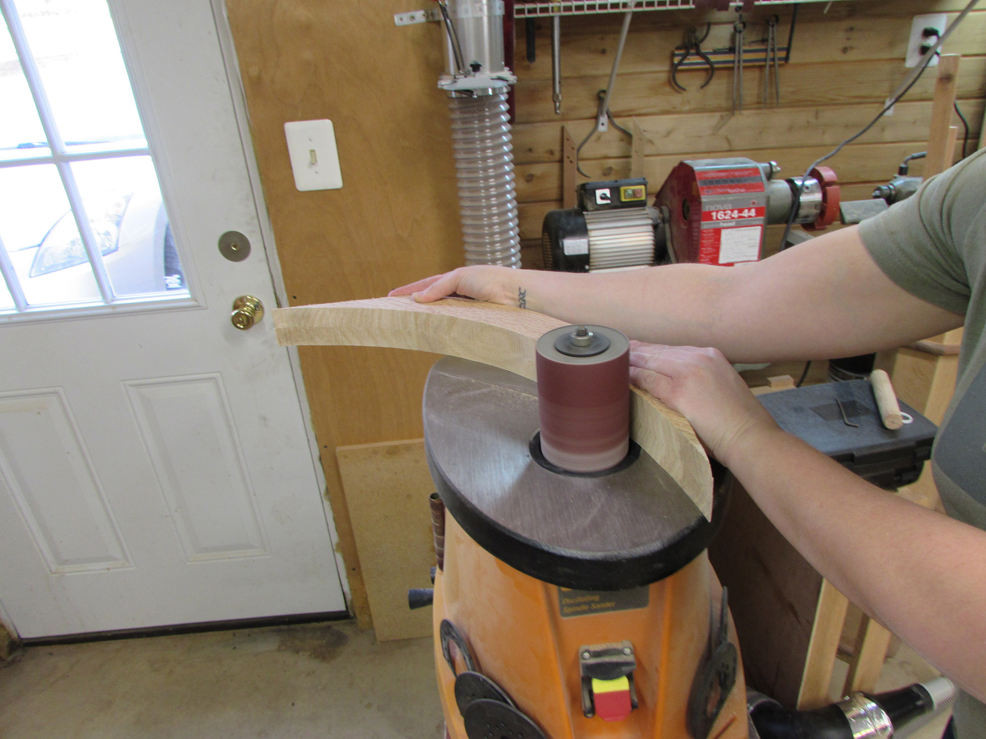 Once they were roughly shaped, Erin started cleaning up the edges on the spindle sander.