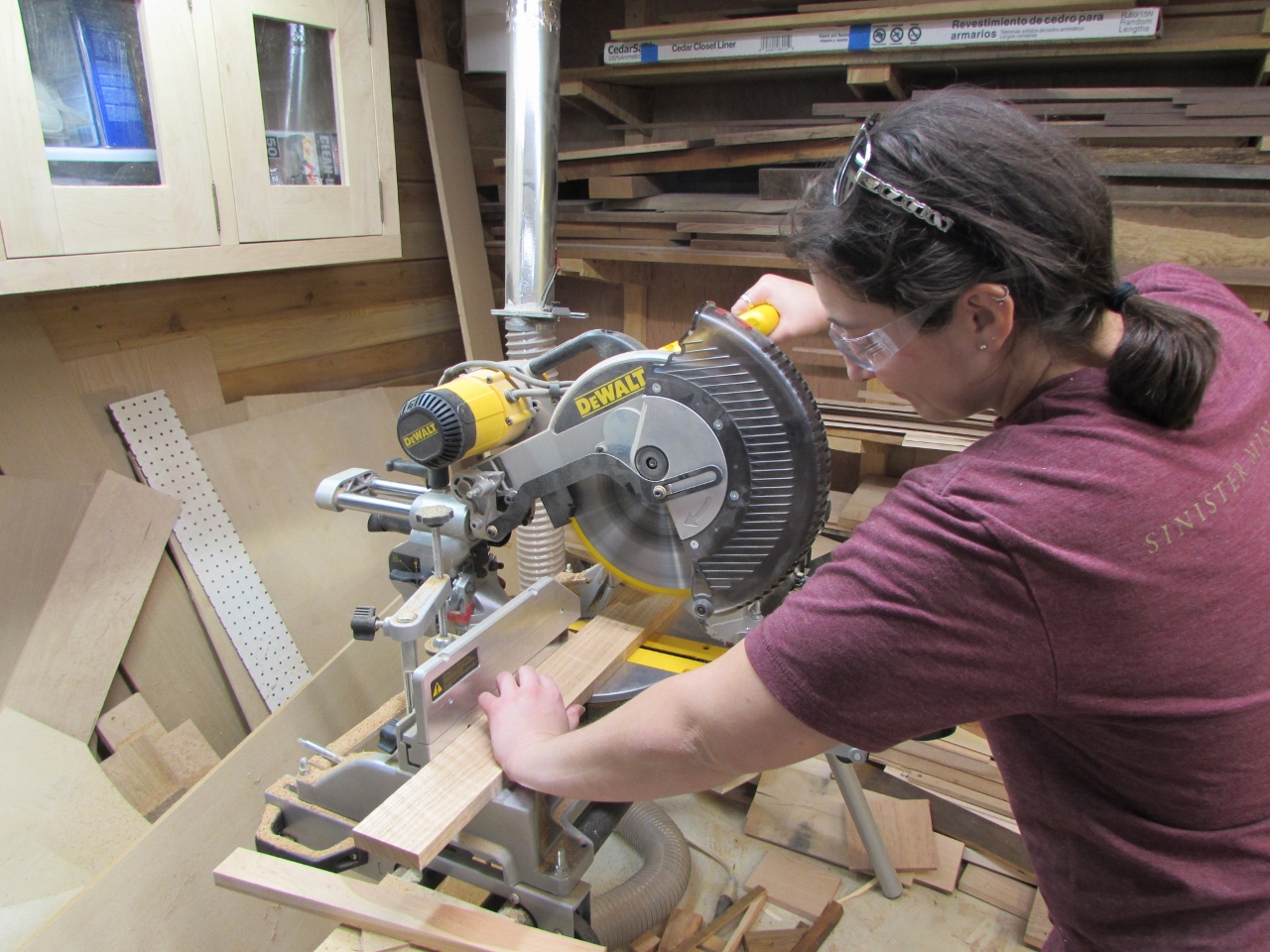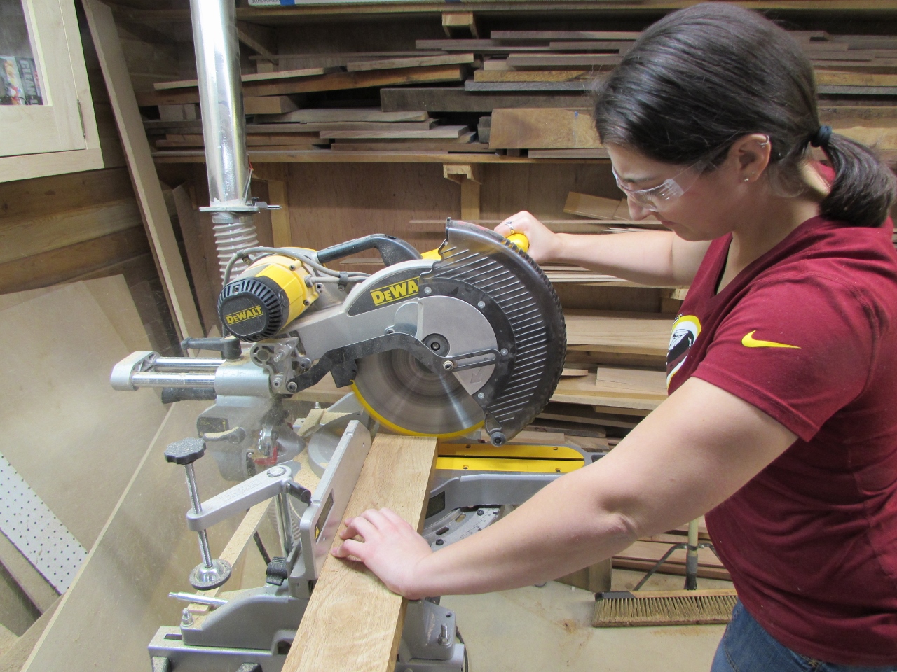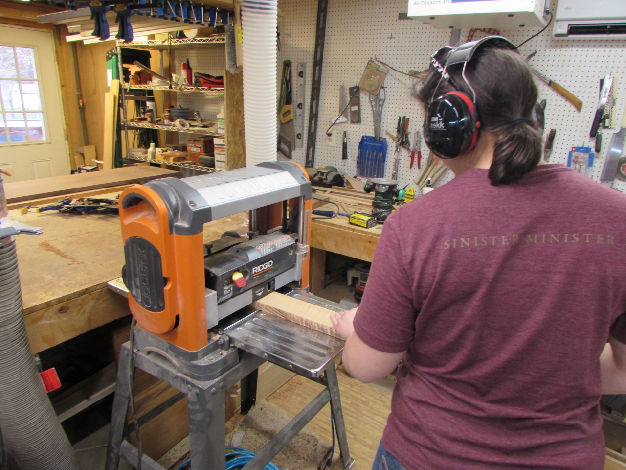 Next we moved on to the top pieces. She cut two pieces 3″ wide and 15-3/4″ long, and we planed them down to 3/4″ thick.