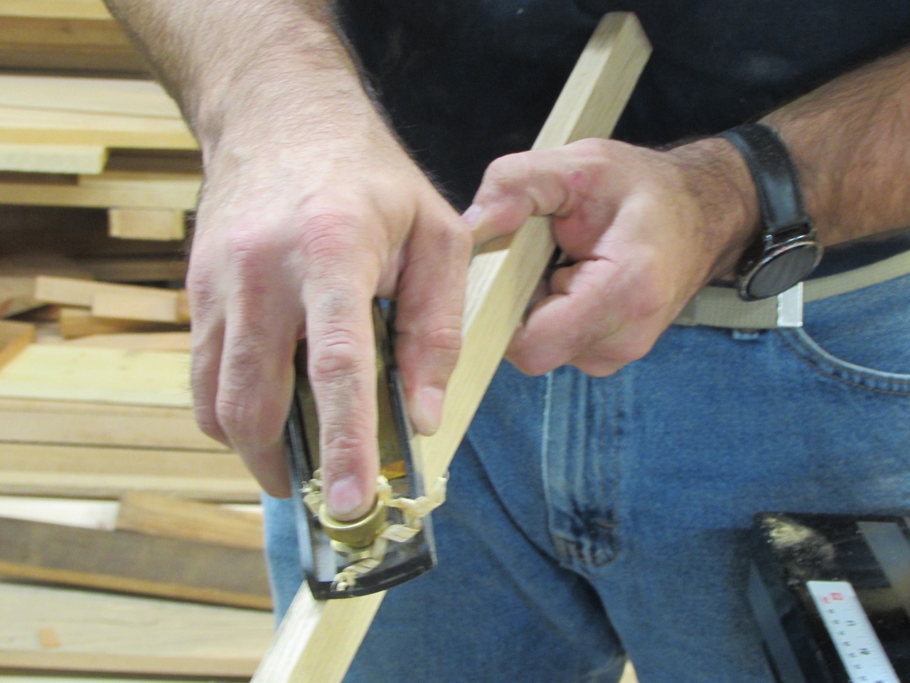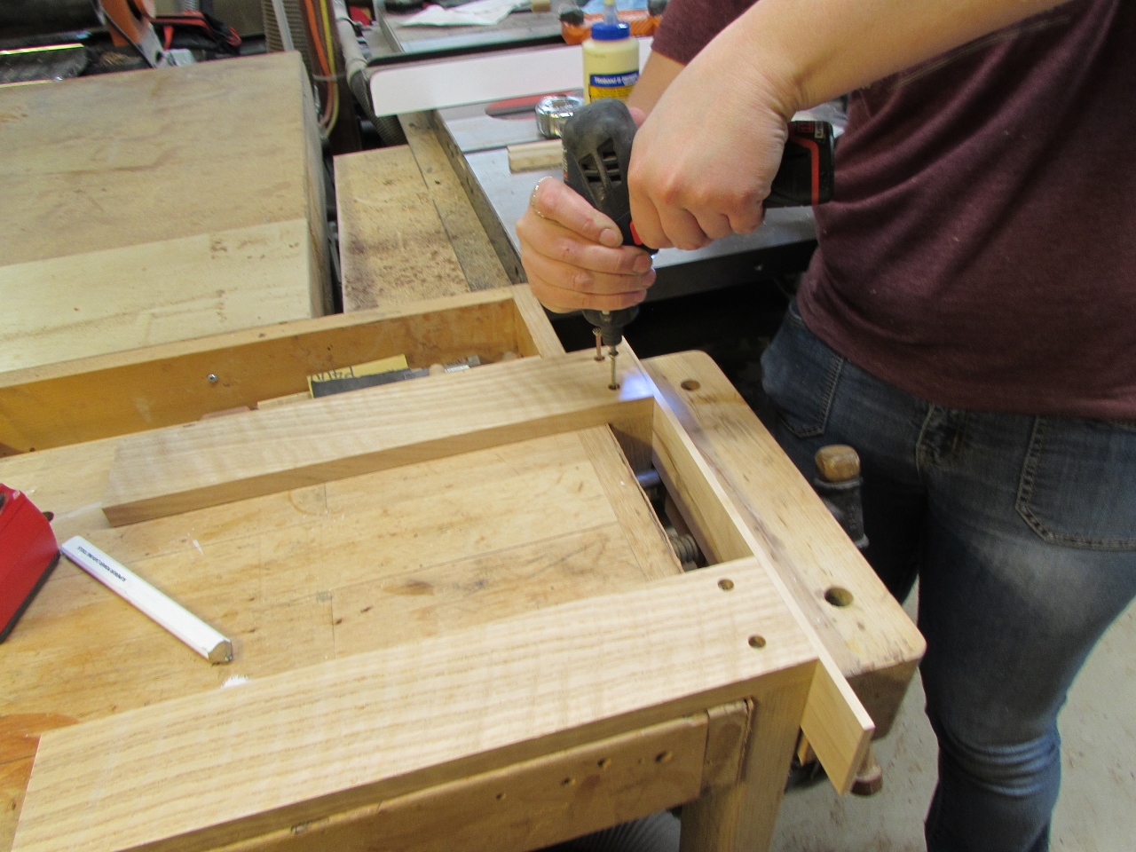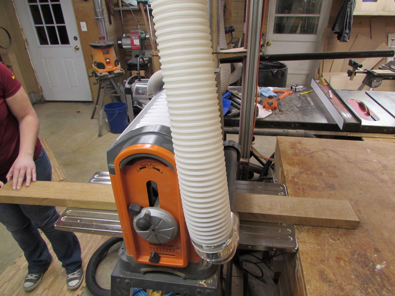 Next we moved on to the top pieces. She cut two pieces 3″ wide and 15-3/4″ long, and we planed them down to 3/4″ thick.