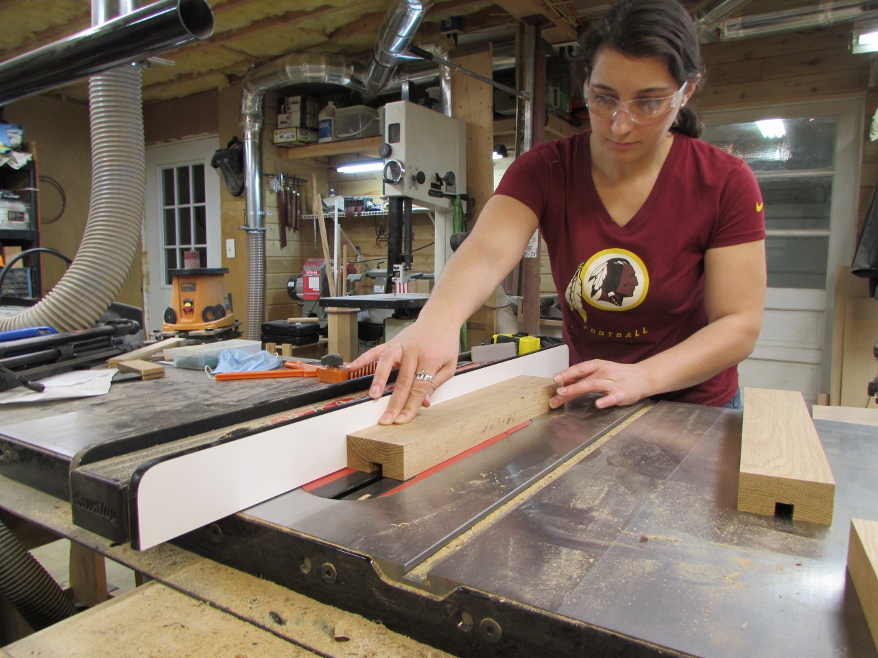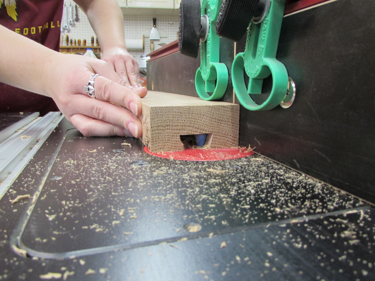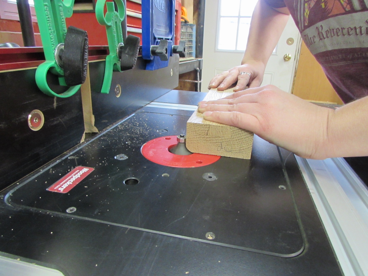 Erin switched out the dovetail bit for the 3/8″ round-over bit and rounded three of the four face sides of the back piece.