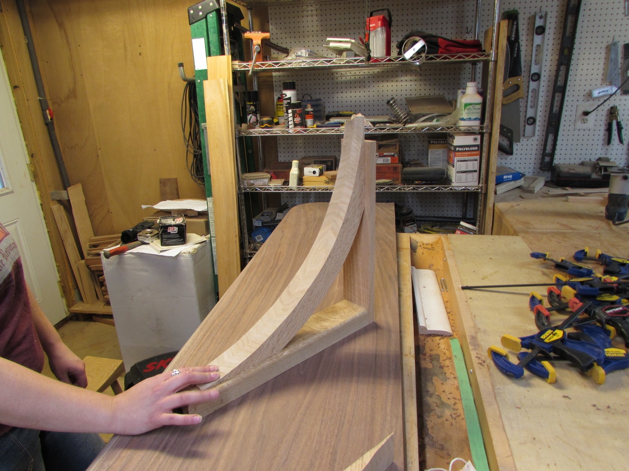 We ran out of time, but the next step will be to radius the edges, then attach the curves to the support brackets, then we will be done the corbels. Erin has to do a bit of demo to the wall, where this will be mounted, so we are not in a big hurry to finish. She decided that she wants to experiment with a bit of inlay on the surface of the counter top. She is refining her design choices now, so stay tuned.