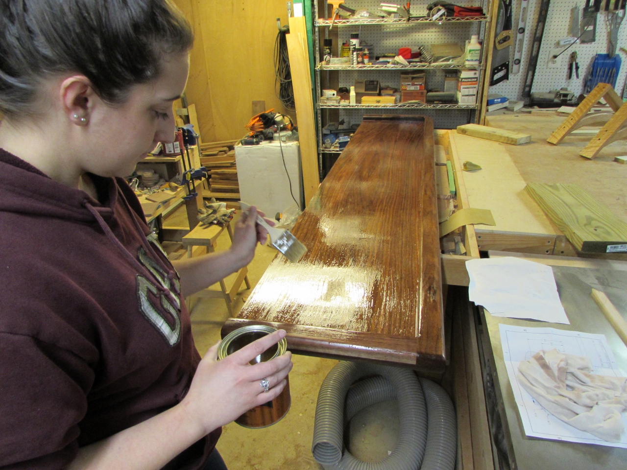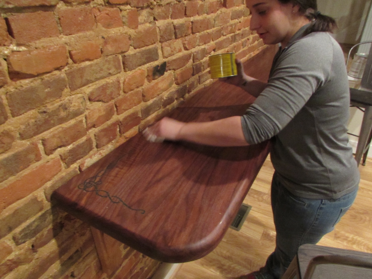 After the first coat of urethane had cured, I had Erin sand down everything with 400 grit paper.