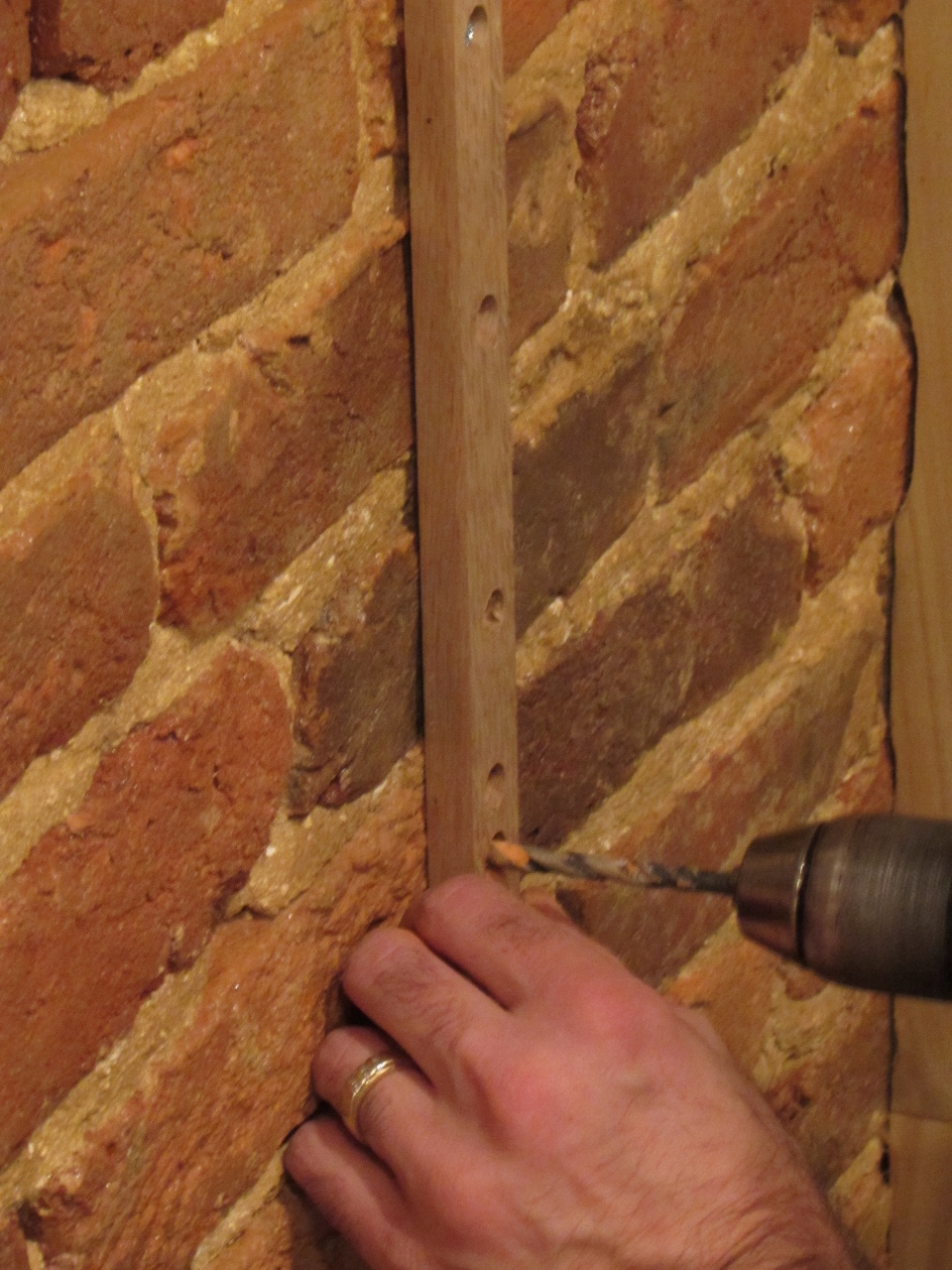 I marked the wall at 40-1/4″ to locate the top of the dovetail. That will place the counter top at exactly 42″. After locating the dovetail on the wall, I marked and drilled the first hole.
