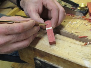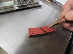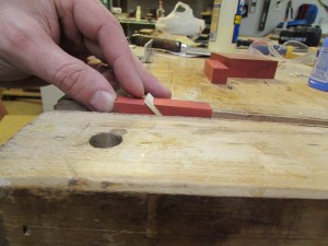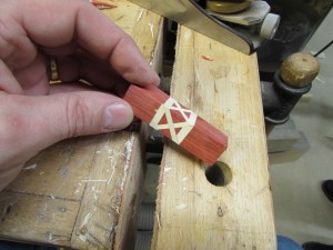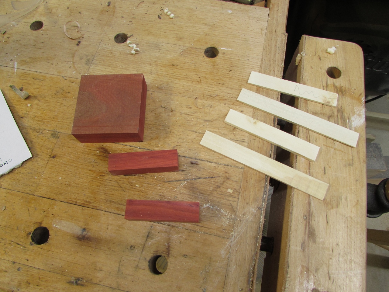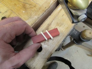 I dug around my scrap bin for something a little different. I came up with a piece of redheart and some holly. I bought the piece of redheart a while back, just because it was different. I don’t play with exotic wood much, but I wanted to see what it was like. The holly came from a tree, that I cut down, a few years back, at my in-law’s. I wanted to make something out of it, for them, but it wouldn’t dry flat. Instead, I have a pile of twisted boards. I figured I would start cutting them down to small pieces and strips. My wife can make pens and other small things, on the lathe, with it. I cut two 5/8″ blanks from the redheart, and a couple of thin strips of the holly.