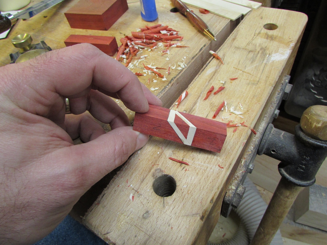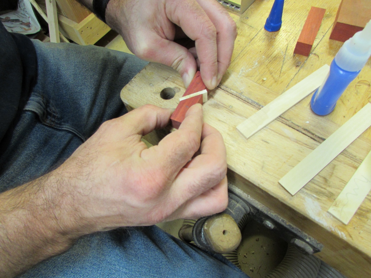 Saving you a bit of repetition, these are shots of rotating, cutting, and inserting the strip three more times. You may be able to see that it is slightly misaligned. I think I need to pre-cut the strips so that they are just slightly smaller than the pen blank. this will allow me to keep the sides dead parallel. As it is, I was glueing them up by eye…