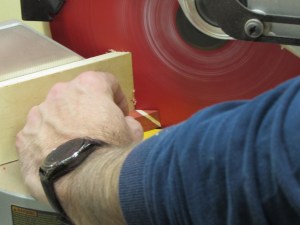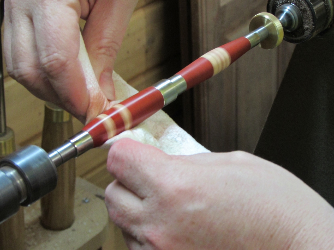 She applied a friction finish that is a combination of shellac and wax. The brand we are using is Shellawax. It is really easy to apply and dries quickly, with just a little buffing. I am not sure how strong a finish it is, but it is a great for beginners.