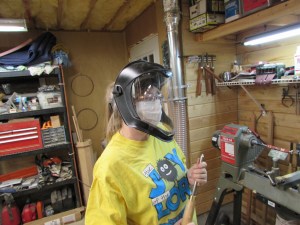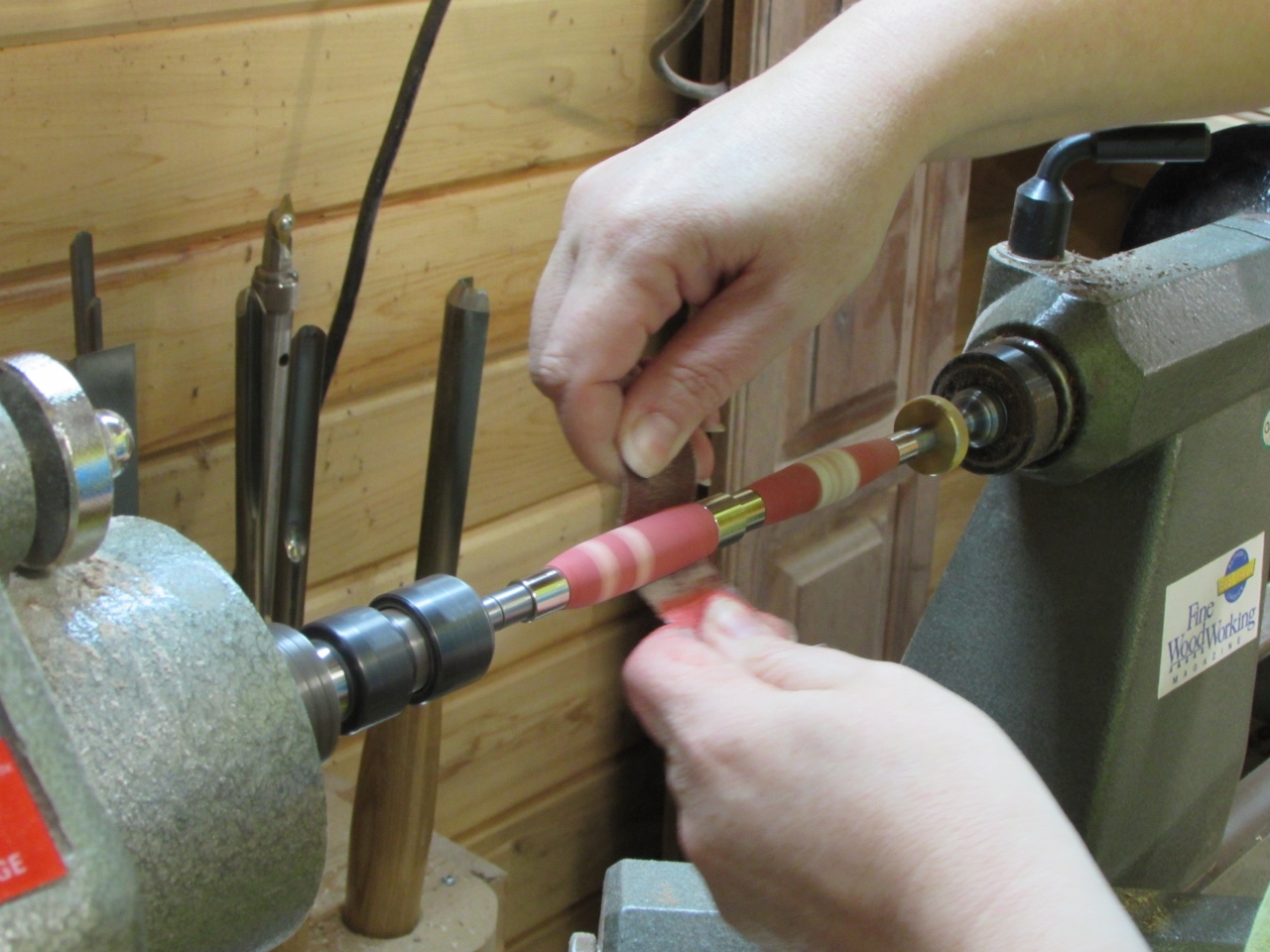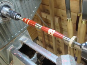 Once the blanks are faced, leaving a flat face, perfectly perpendicular to the center of the tube, she chucked it up on the pen mandrill. Hmm, maybe since we have to use the barrel trimmer anyway, I will have her use the band saw to trim her blanks in the future. That is way safer.
