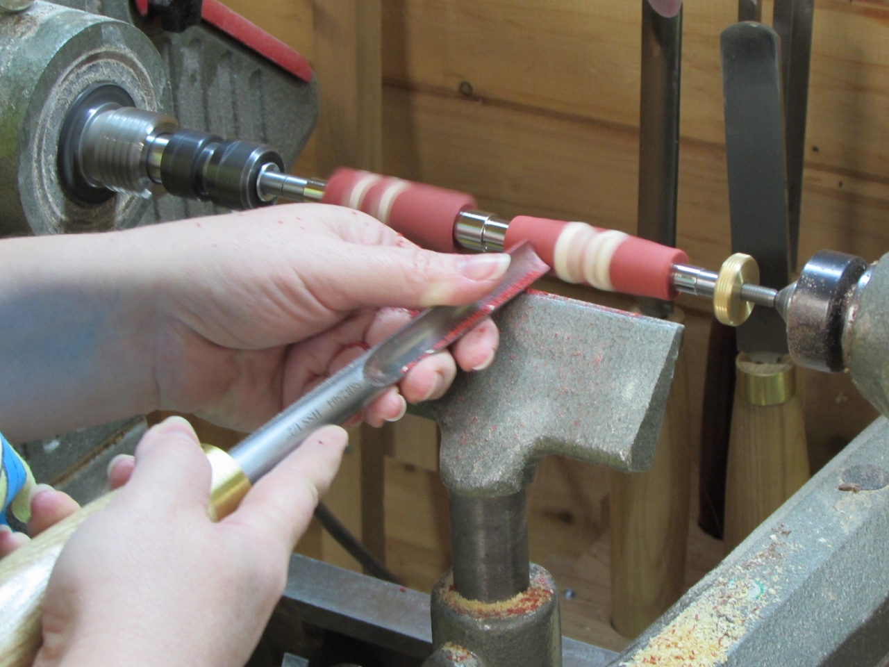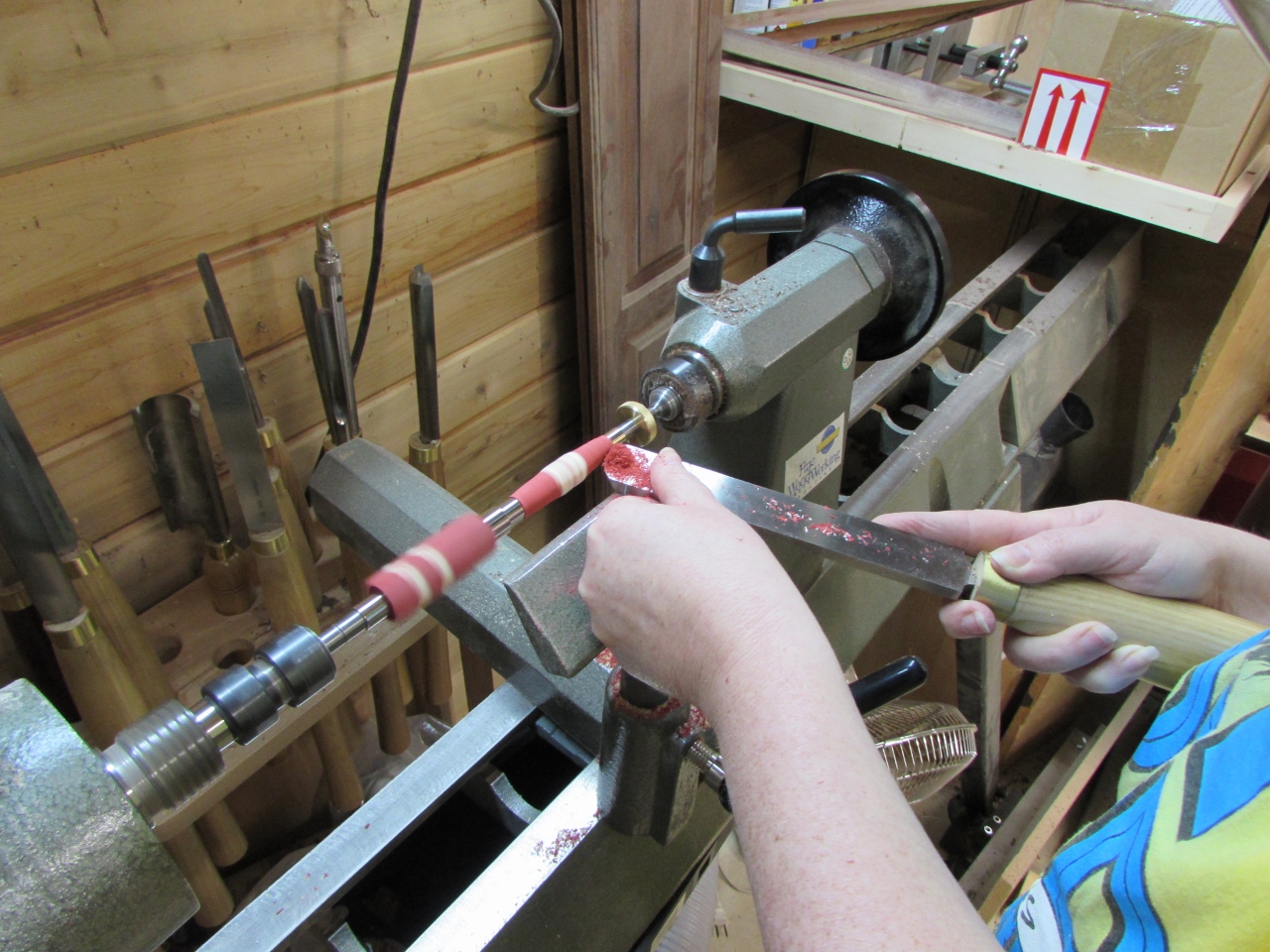 I handed off the blanks to my dear wife and let her start playing. Please note, this has all taken less than half an hour. Some of the CA glue has only been set for about a minute or two, and it is already cured enough that she can start machining it.