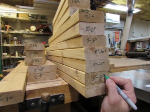 Erin moved on to cutting down all of out 2″x4″s and 2″x6″s to length, and I marked the ends so we could keep track.