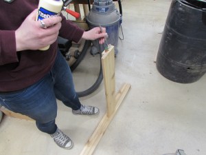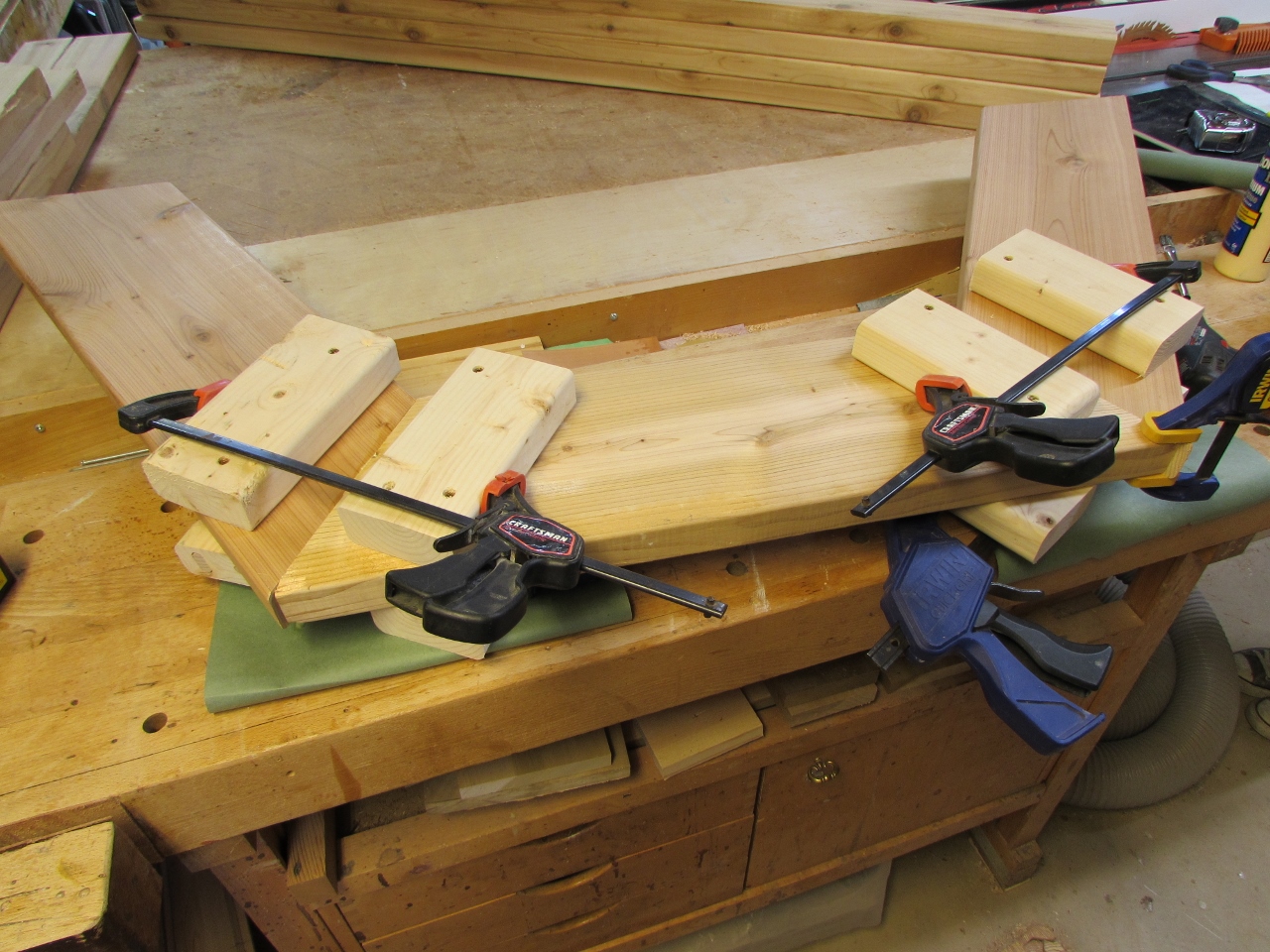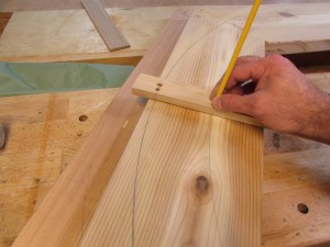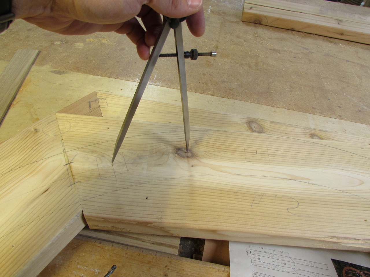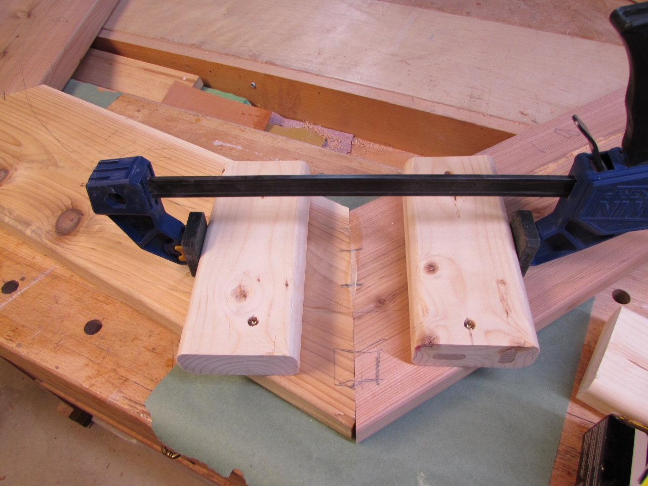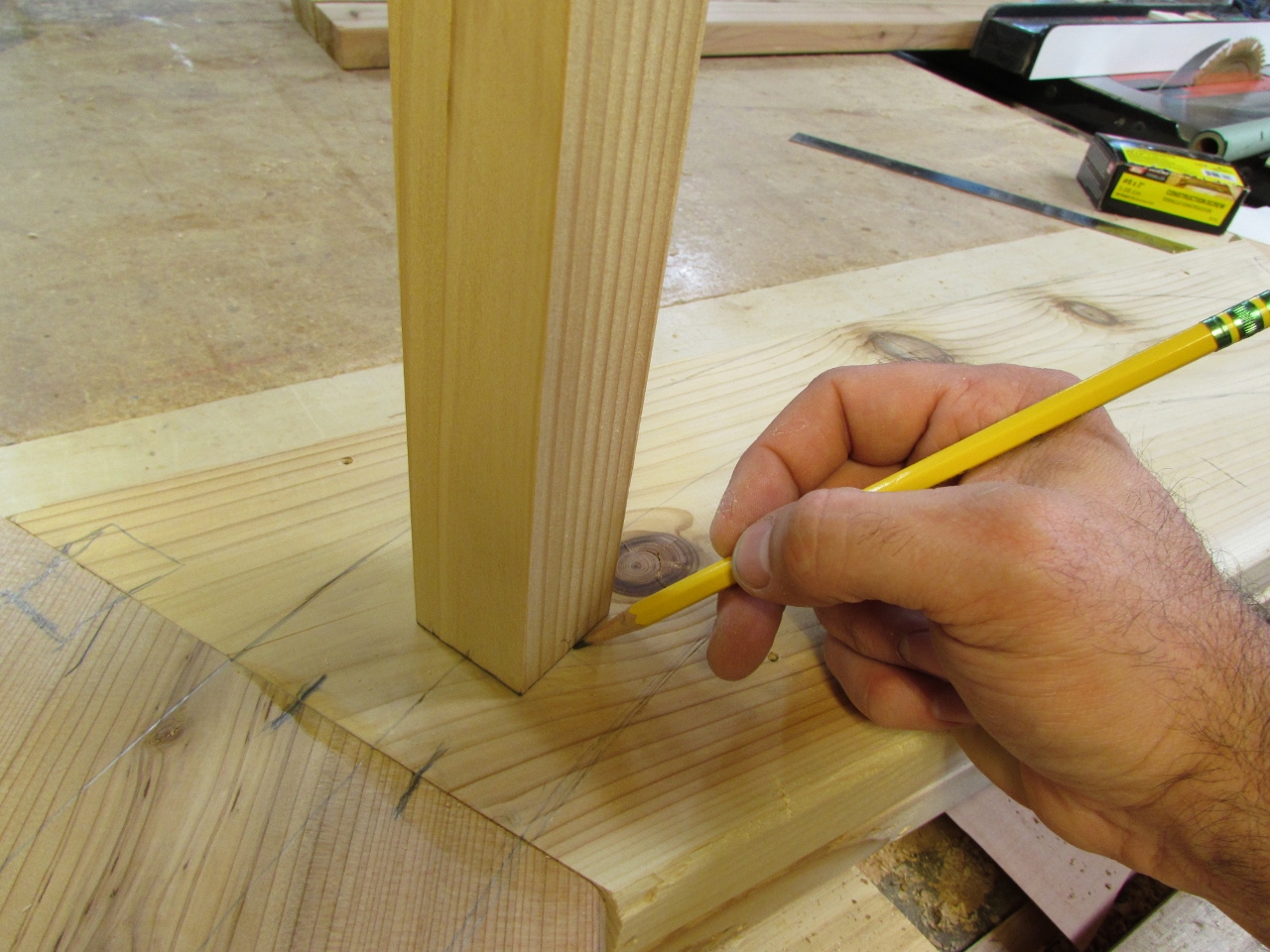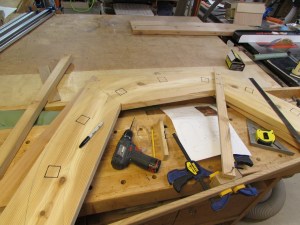 After the glue had set, we did a dry-fit of the frame. Everything fit nice and tight, so we pulled it apart and got back to work on the arches. Before disassembling, I marked the edge of the 2″x4″s, where they contacted the arches.