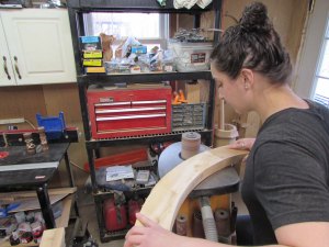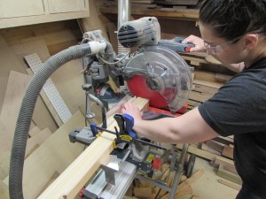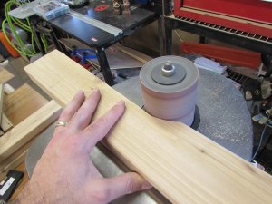 Erin sanded the cut edges down smooth on the spindle sander, then routed a small round-over to the inner and outer edges to match the 2″x4″s that these will mate to.