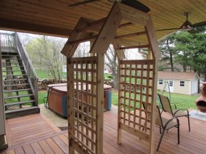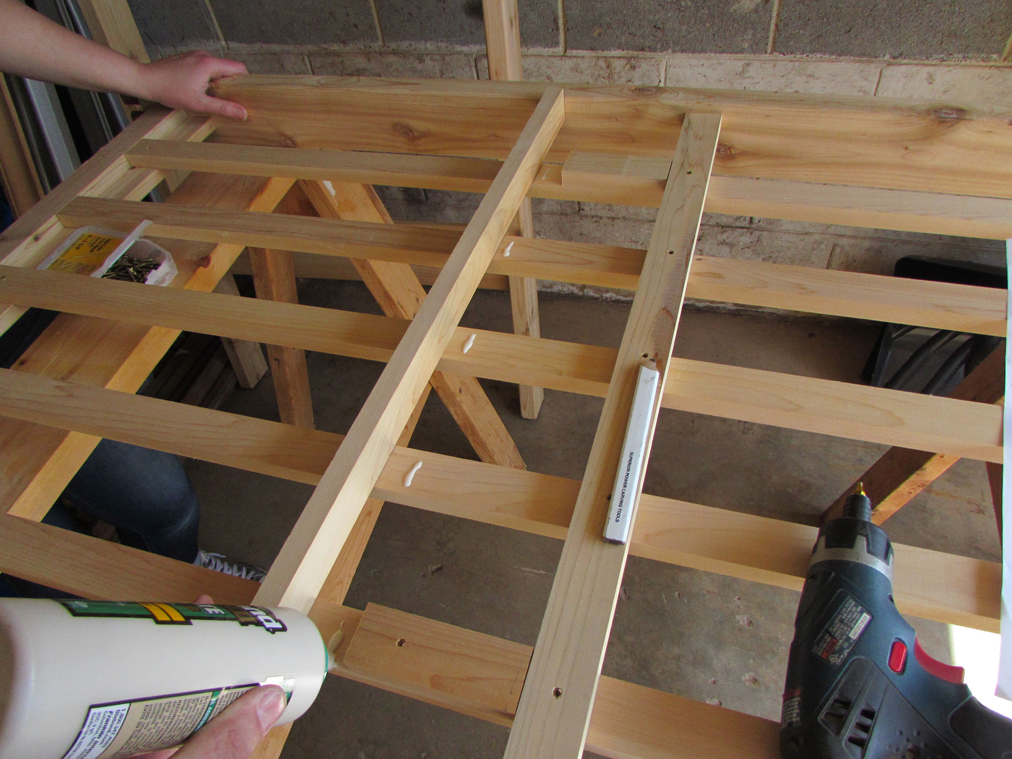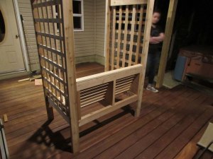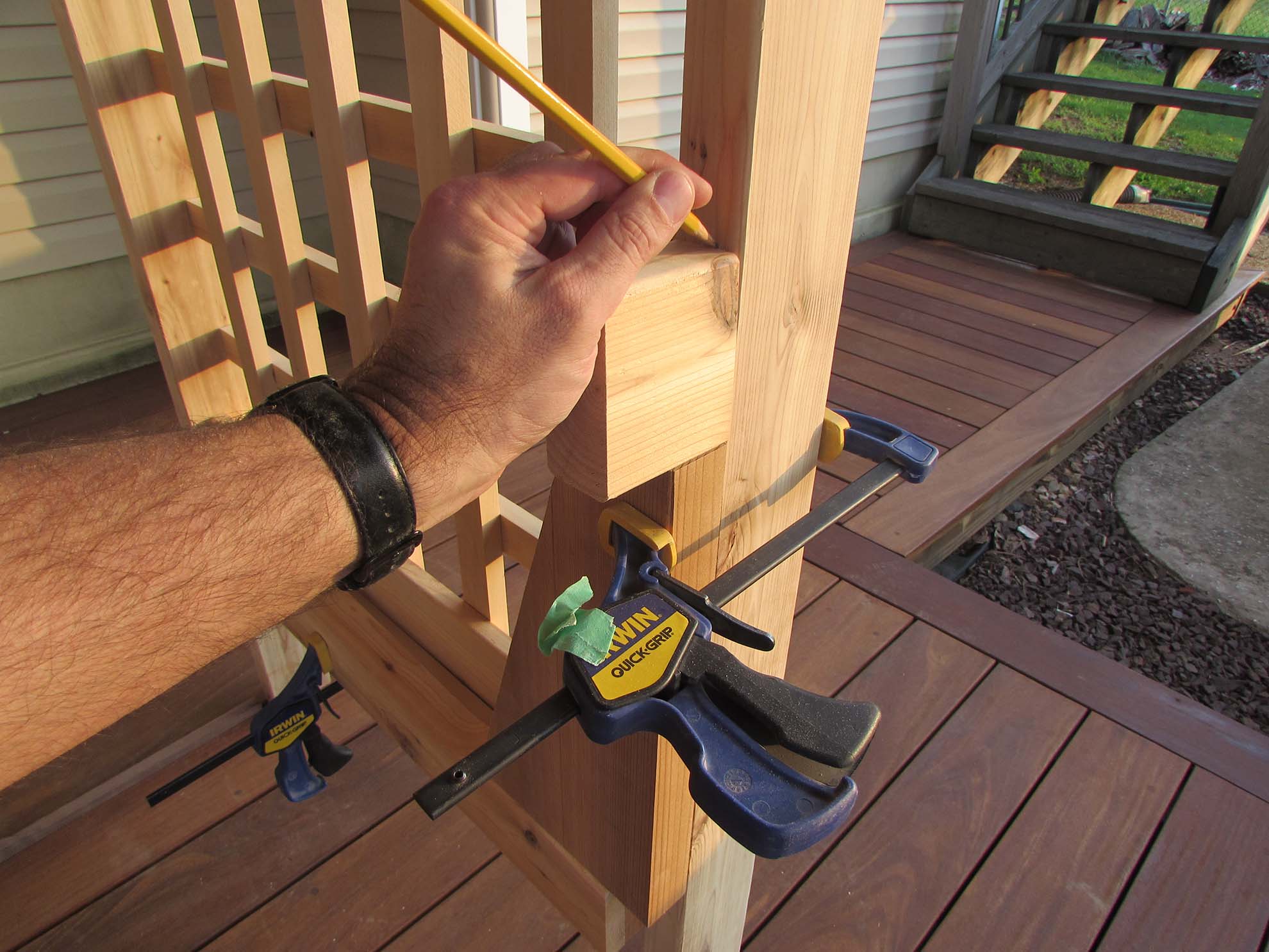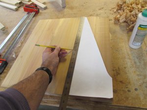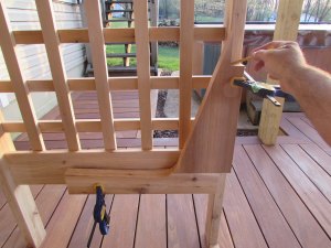 I had Erin work on cutting lattice strips to length while I started laying out the seat supports on a cedar panel that I glued up.