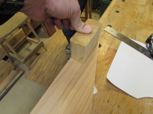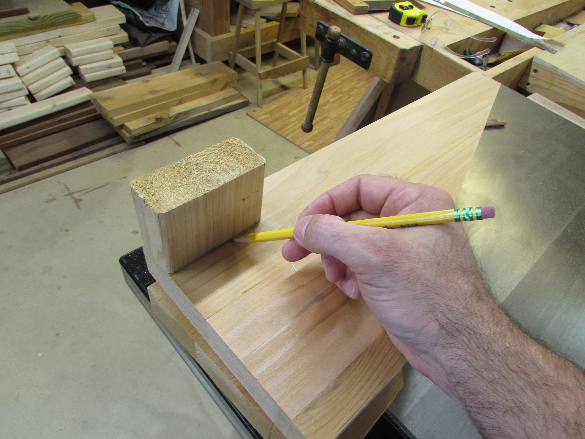 I cut and sanded the seat back supports, then laid out the notch locations with a chunk of 2″x4″.