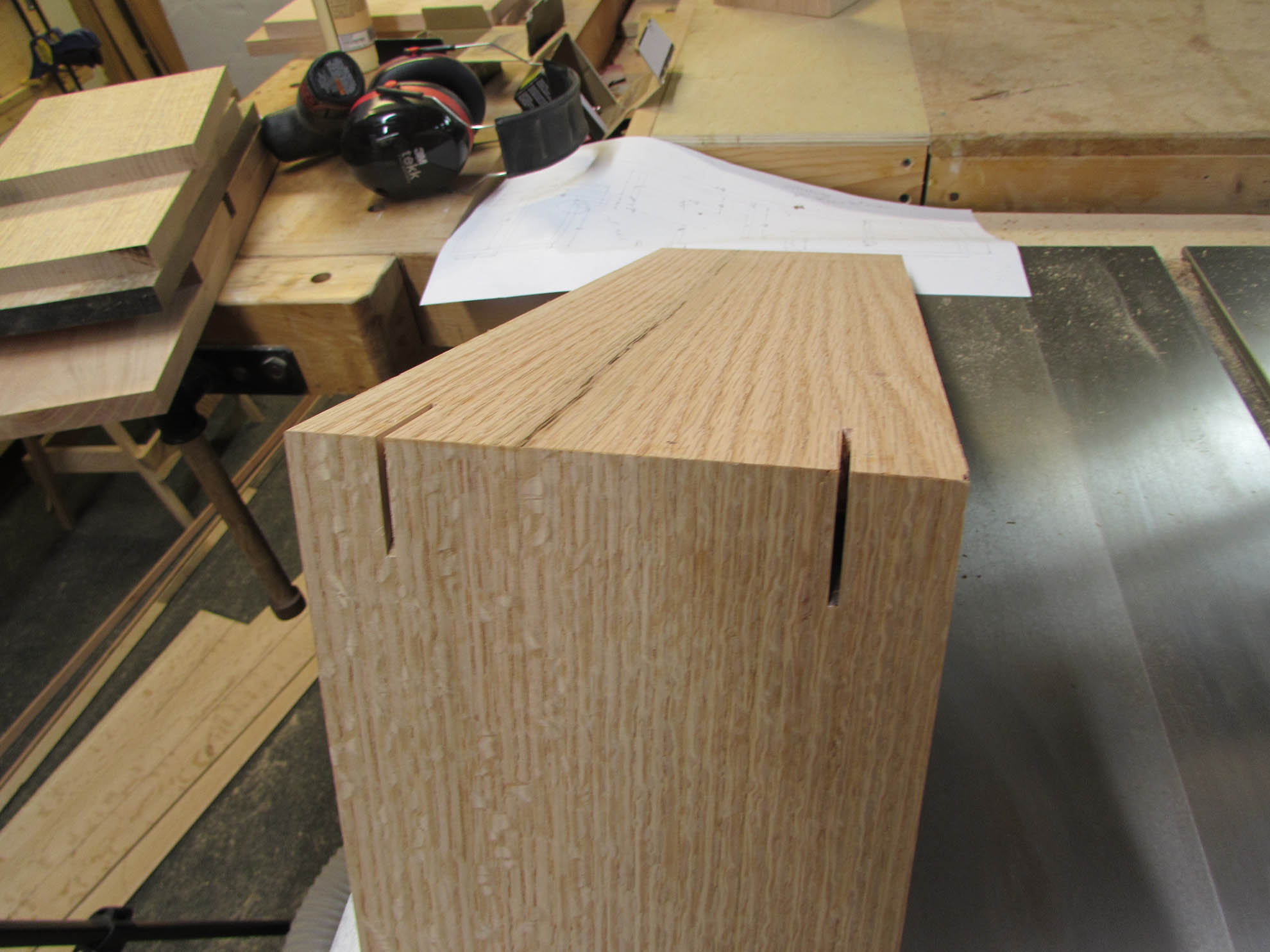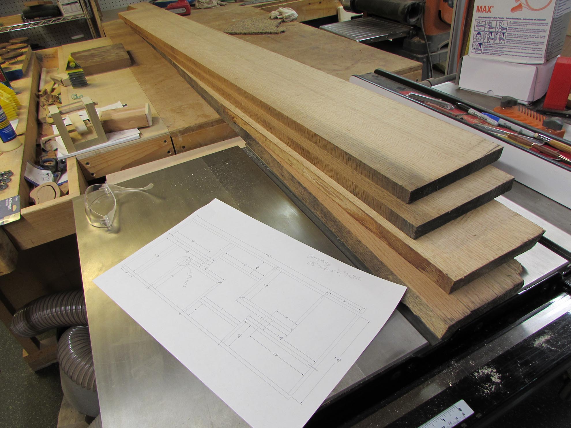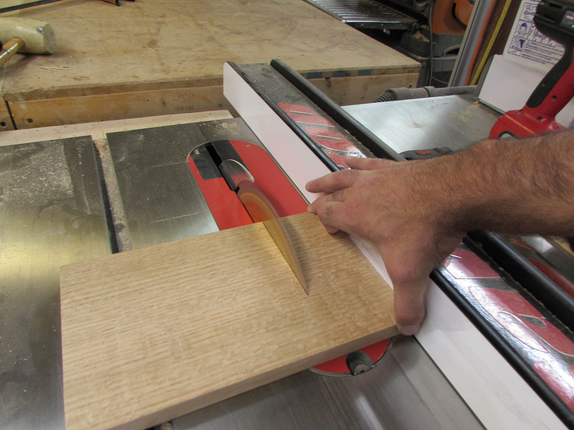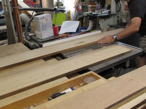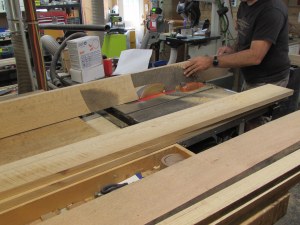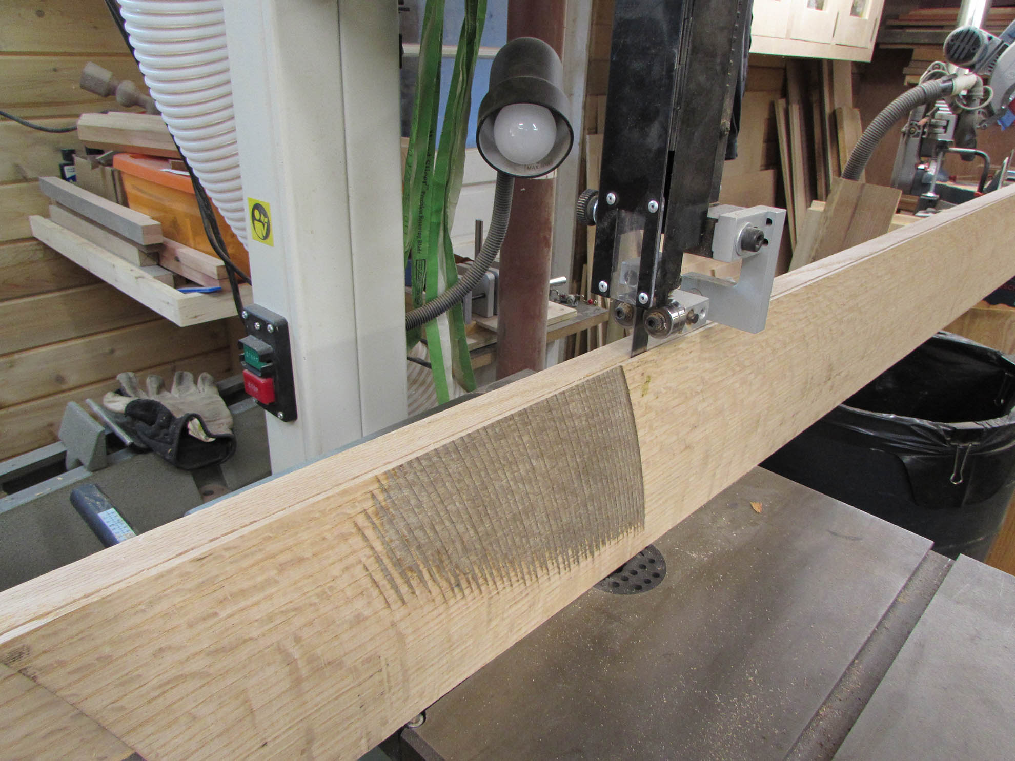 I am using some beautiful quarter-sawn oak on this project. The stuff I have is 5/4″ thick, but that is too thick for these shelves. We decided on 3/4″ so I am re-sawing the boards to get them closer to the required thickness.